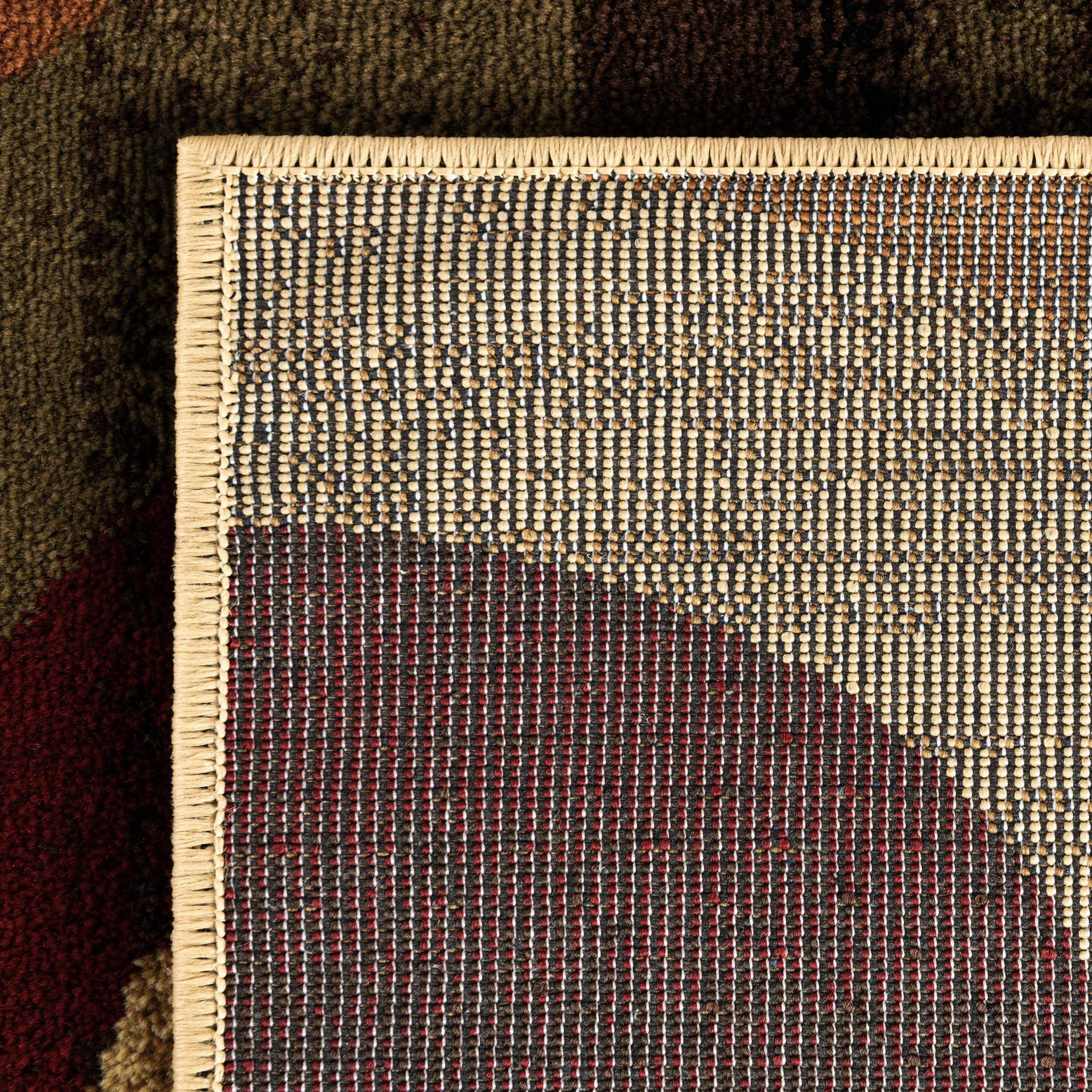 Primary color is Beige. Colors in this rug include: Beige, Black, Blue, Brown, Burgundy, Gray, Olive.