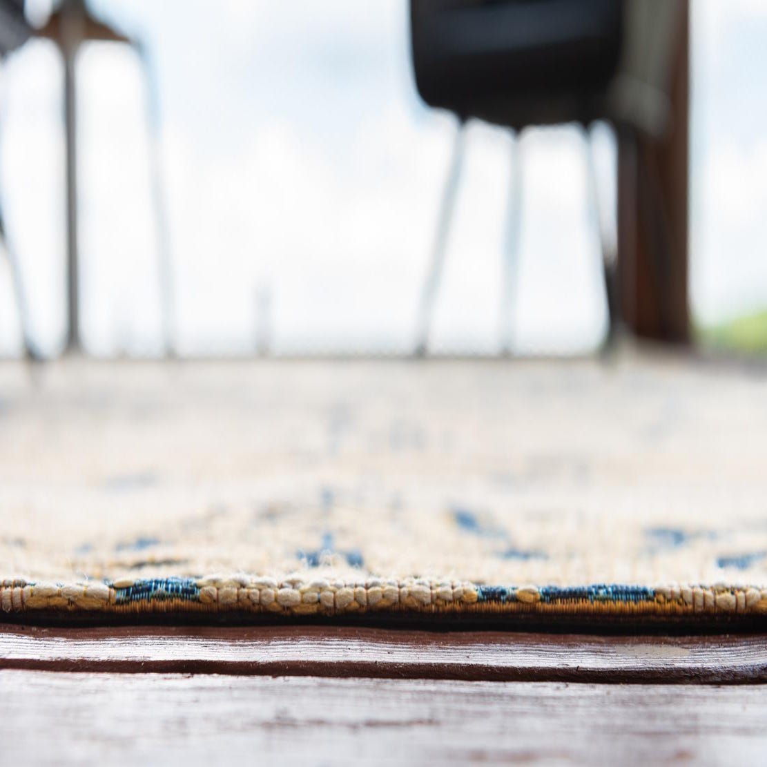 Primary color is Beige. Colors in this rug include: Beige, Blue, Navy Blue.