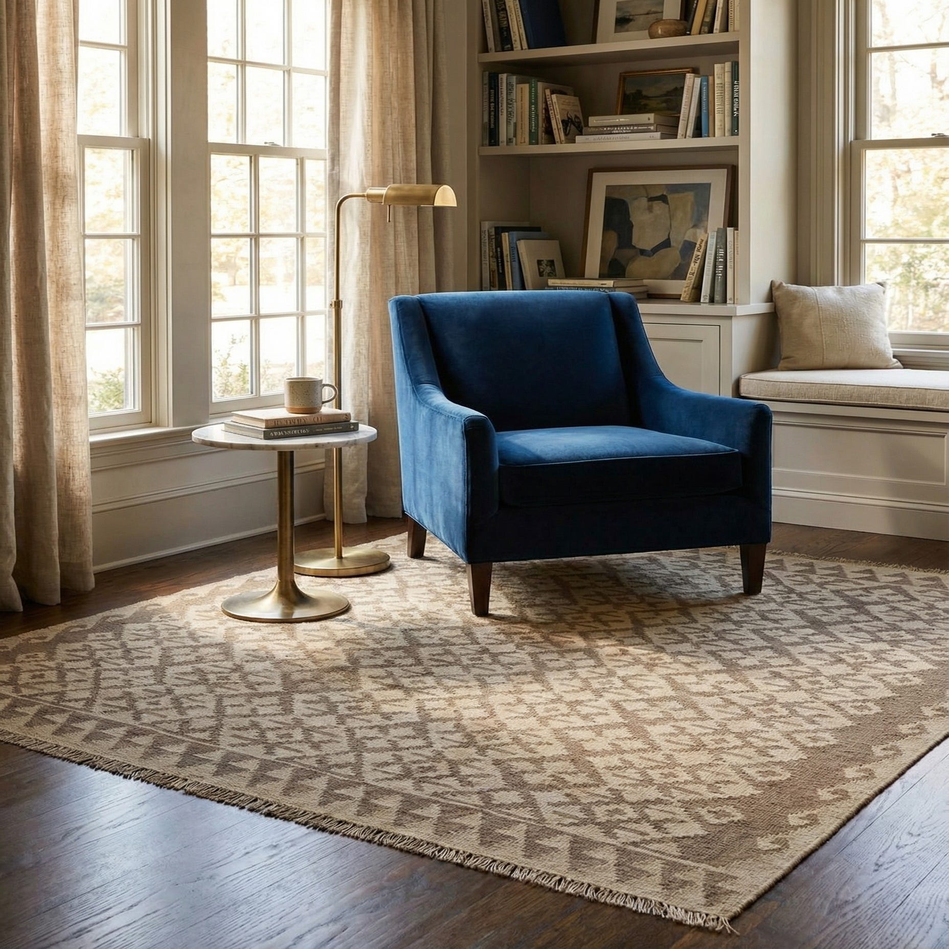 Primary color is Beige. Colors in this rug include: Beige, Brown.