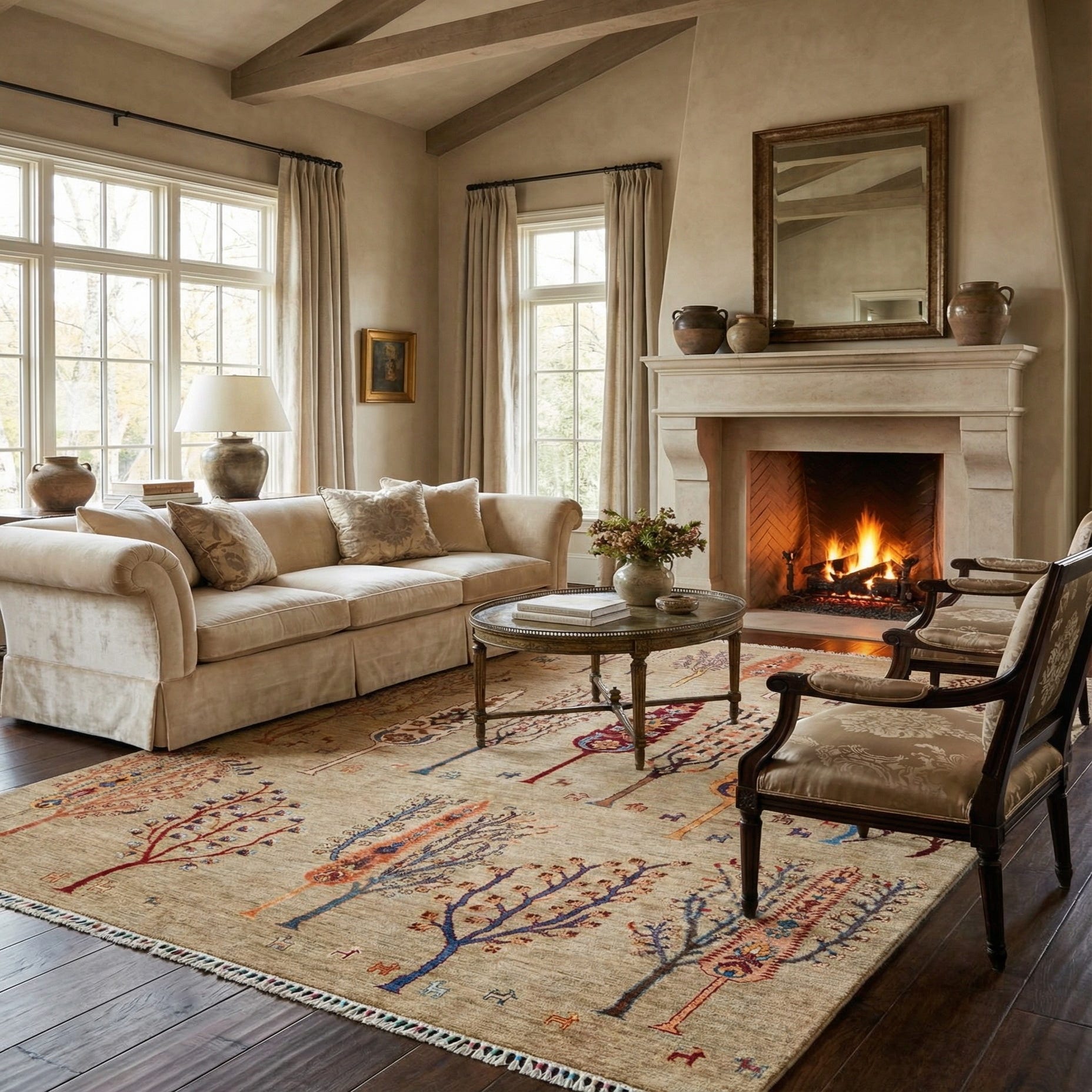 Primary color is Beige. Colors in this rug include: Beige, Ivory, Orange, Red, Navy Blue.
