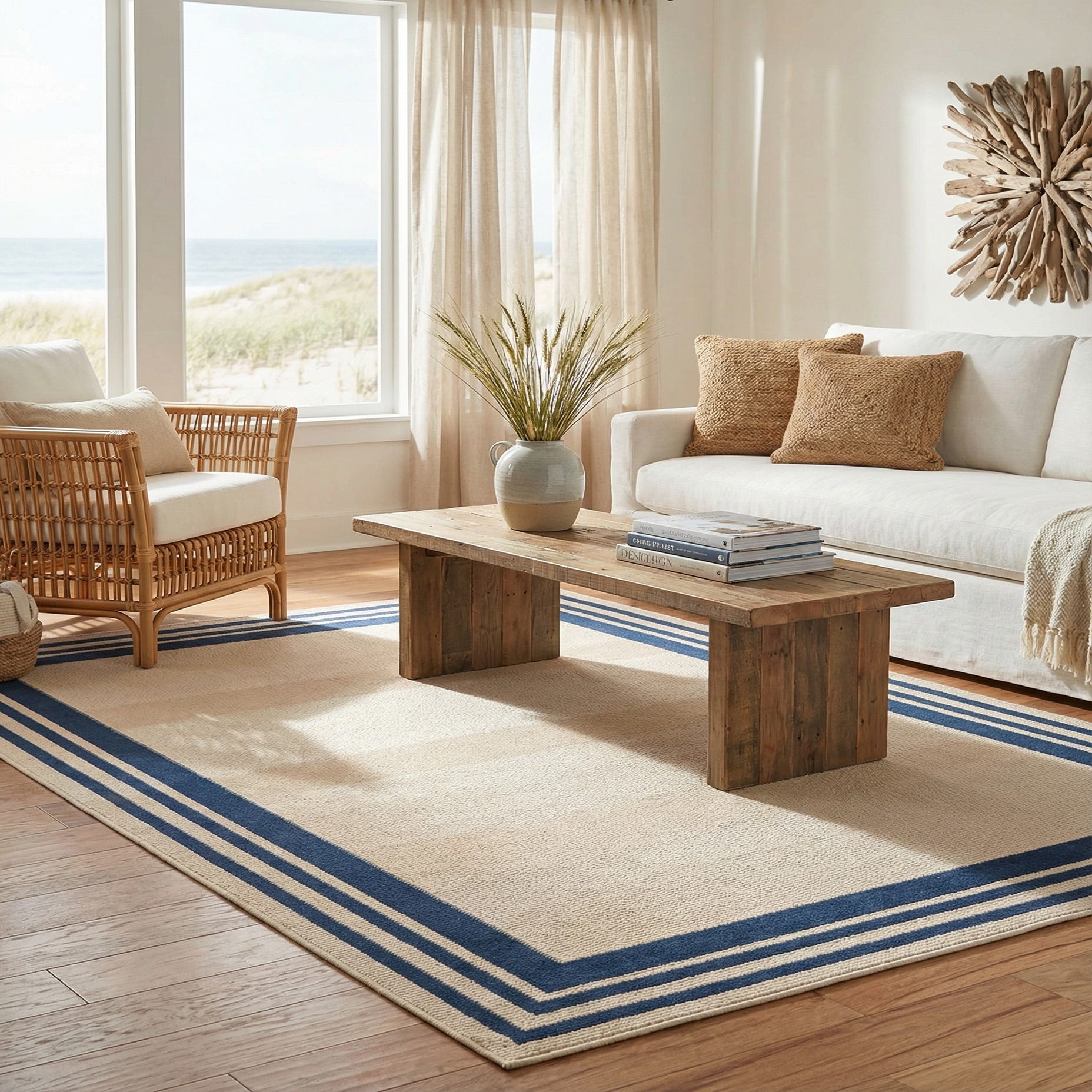 Primary color is Beige. Colors in this rug include: Beige, Navy Blue.