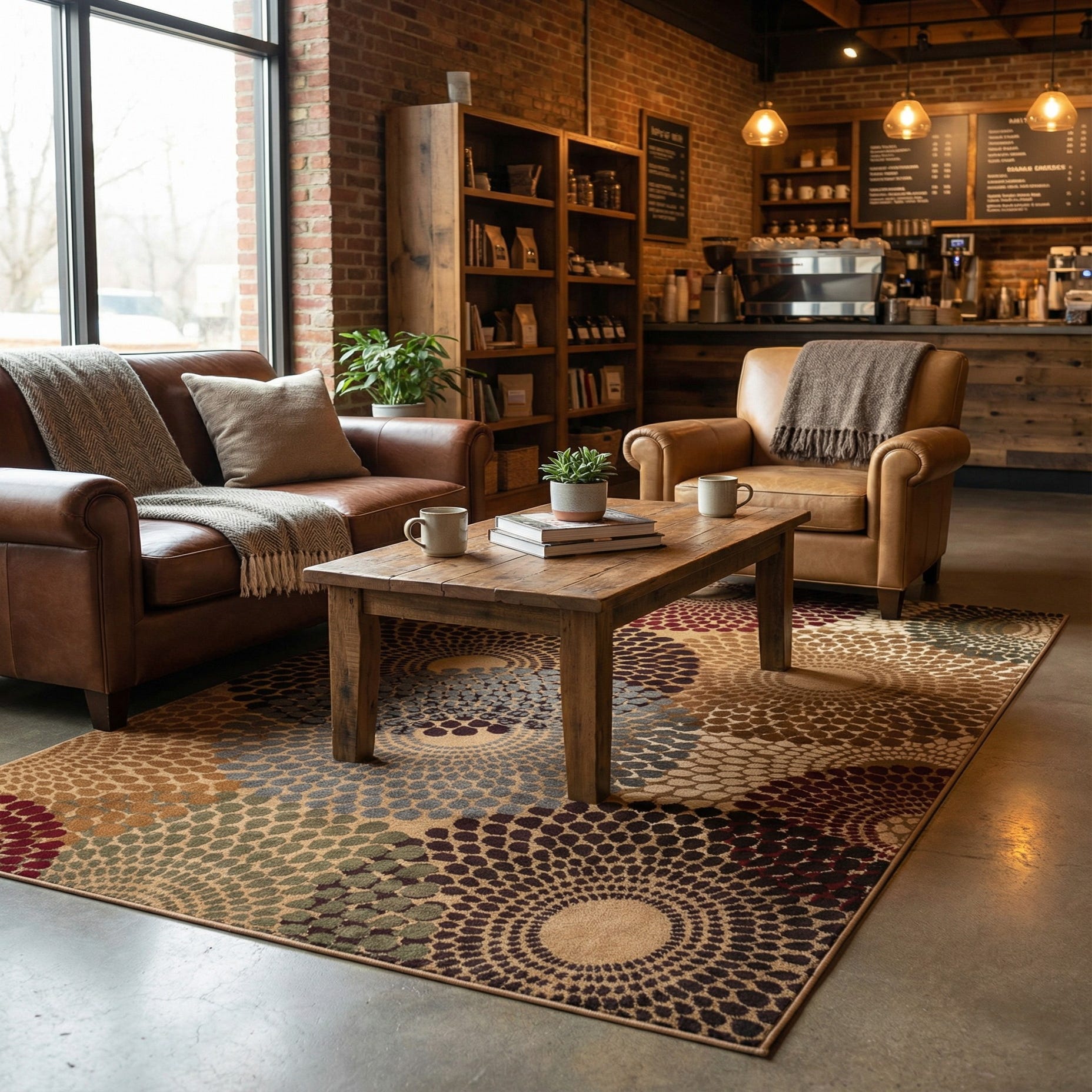 Primary color is Beige. Colors in this rug include: Beige, Black, Blue, Brown, Burgundy, Gray, Olive.