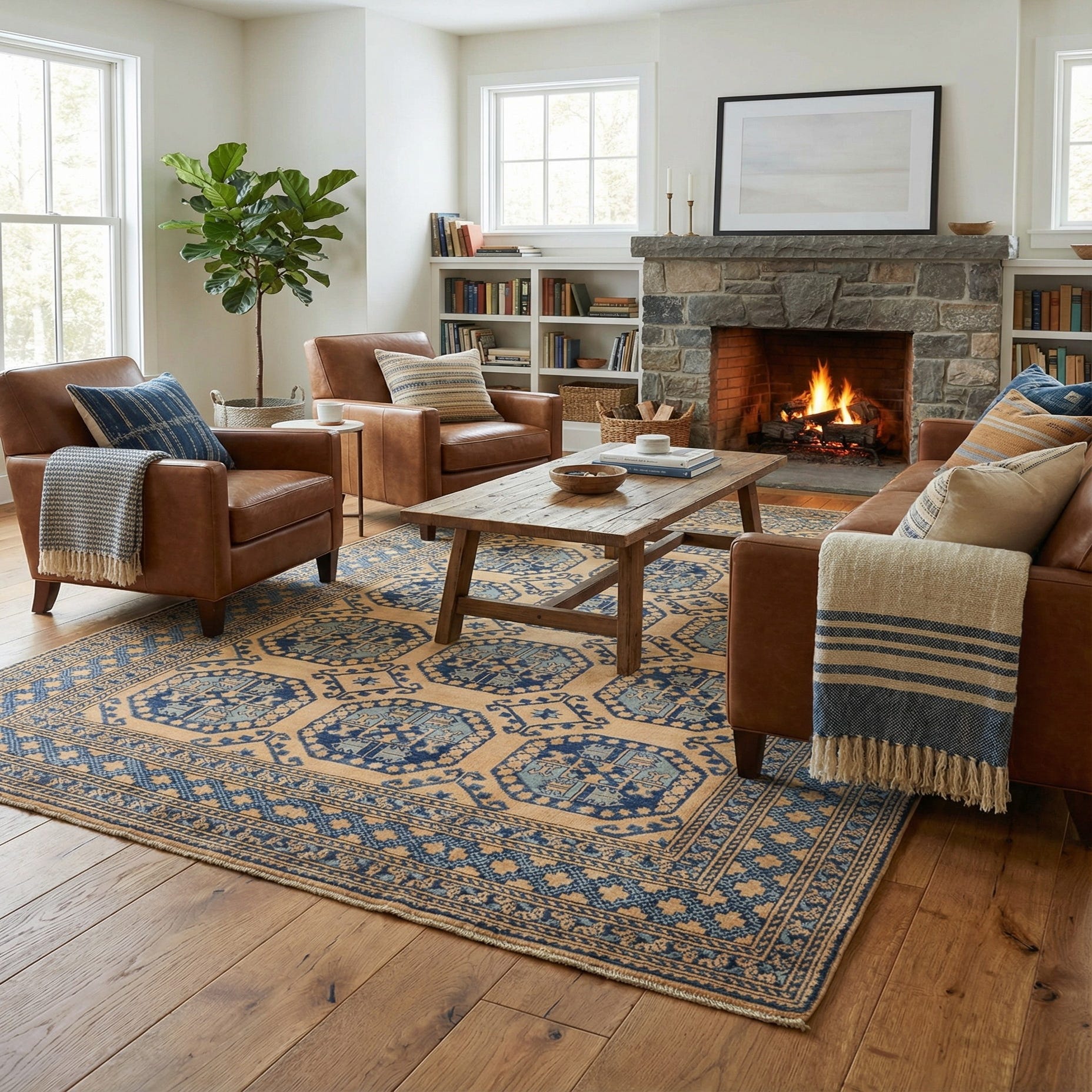 Primary color is Beige. Colors in this rug include: Beige, Black, Blue, Navy Blue, Light Blue.