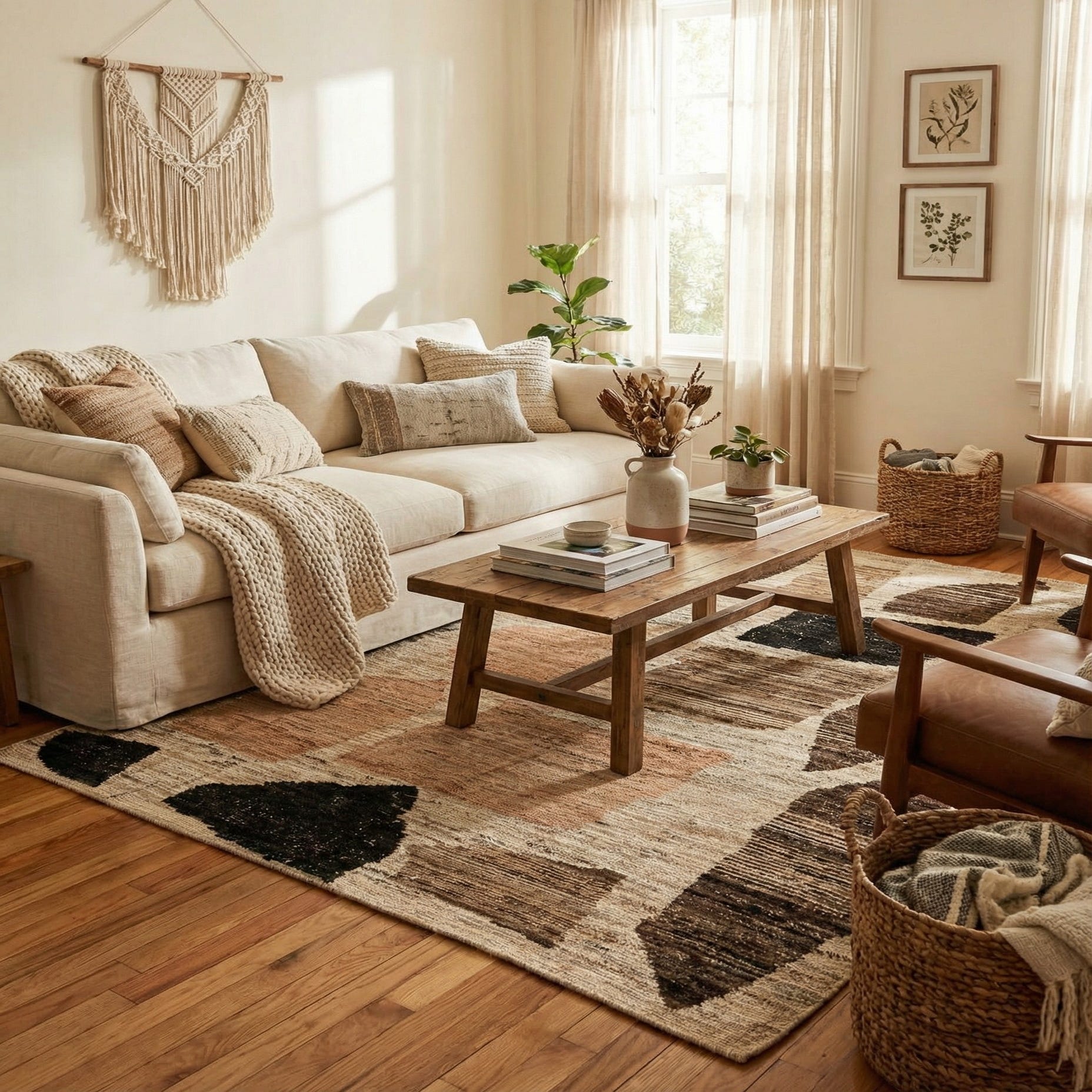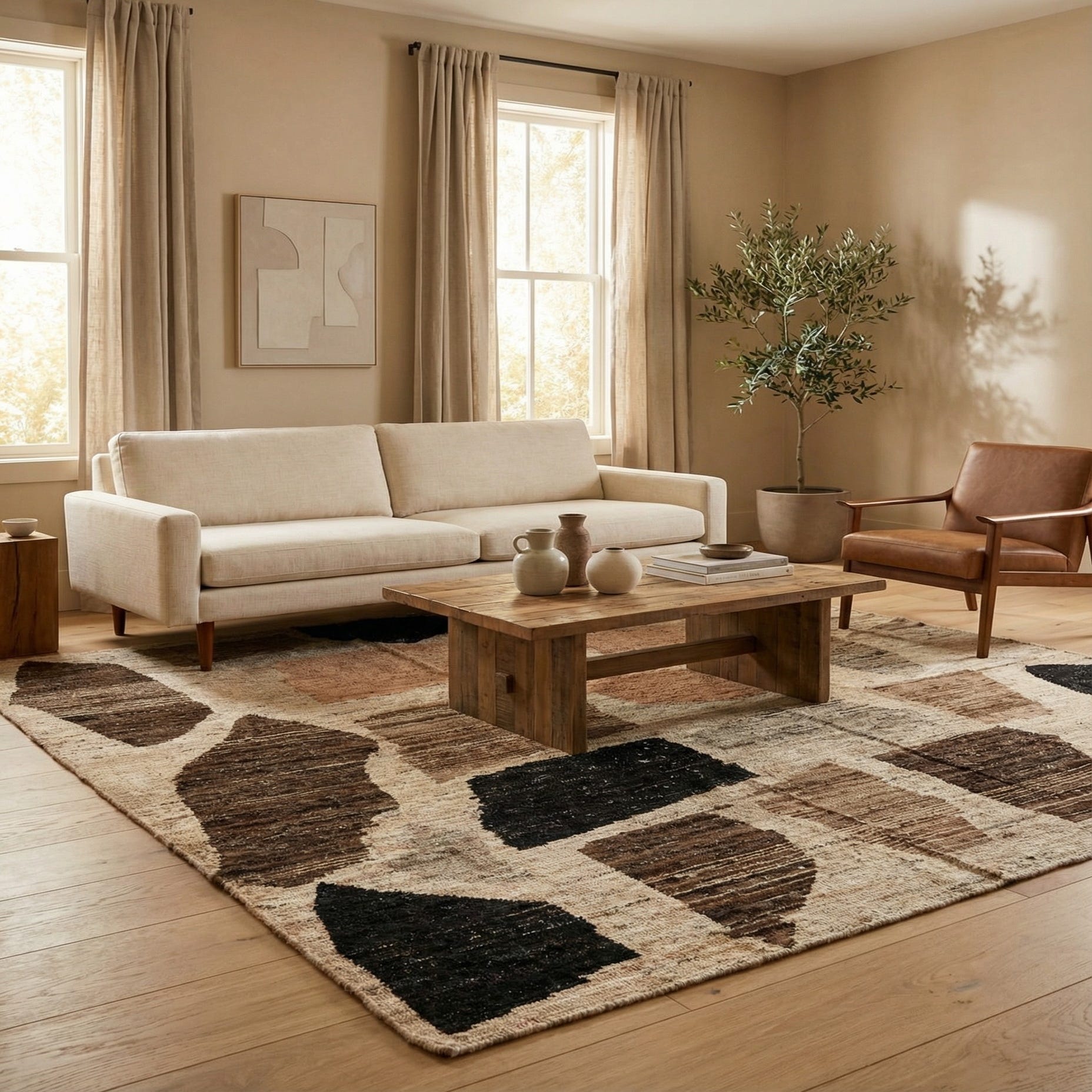 Primary color is Beige. Colors in this rug include: Beige, Black, Brown, Light Brown, Maroon.