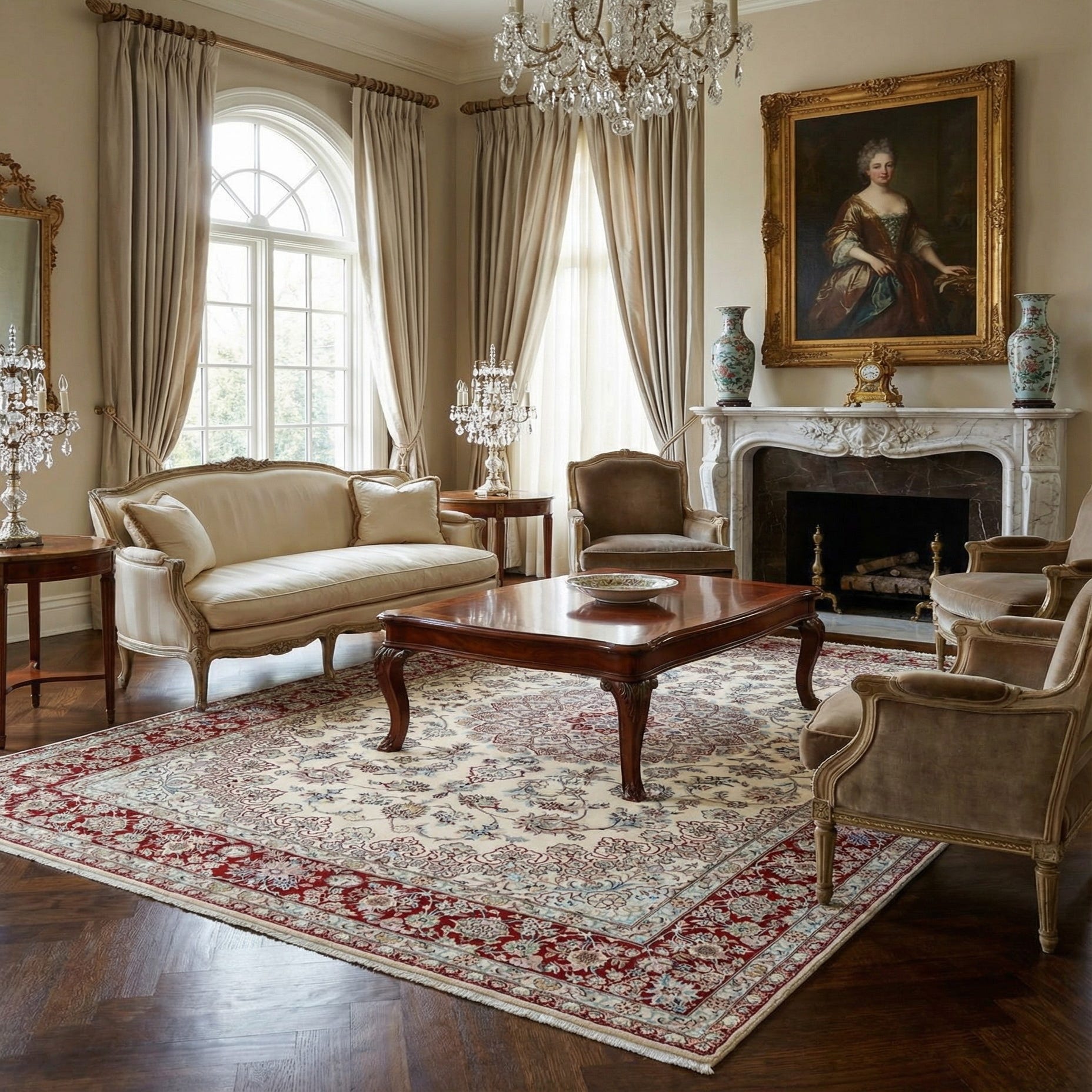 Primary color is Beige. Colors in this rug include: Beige, Red.