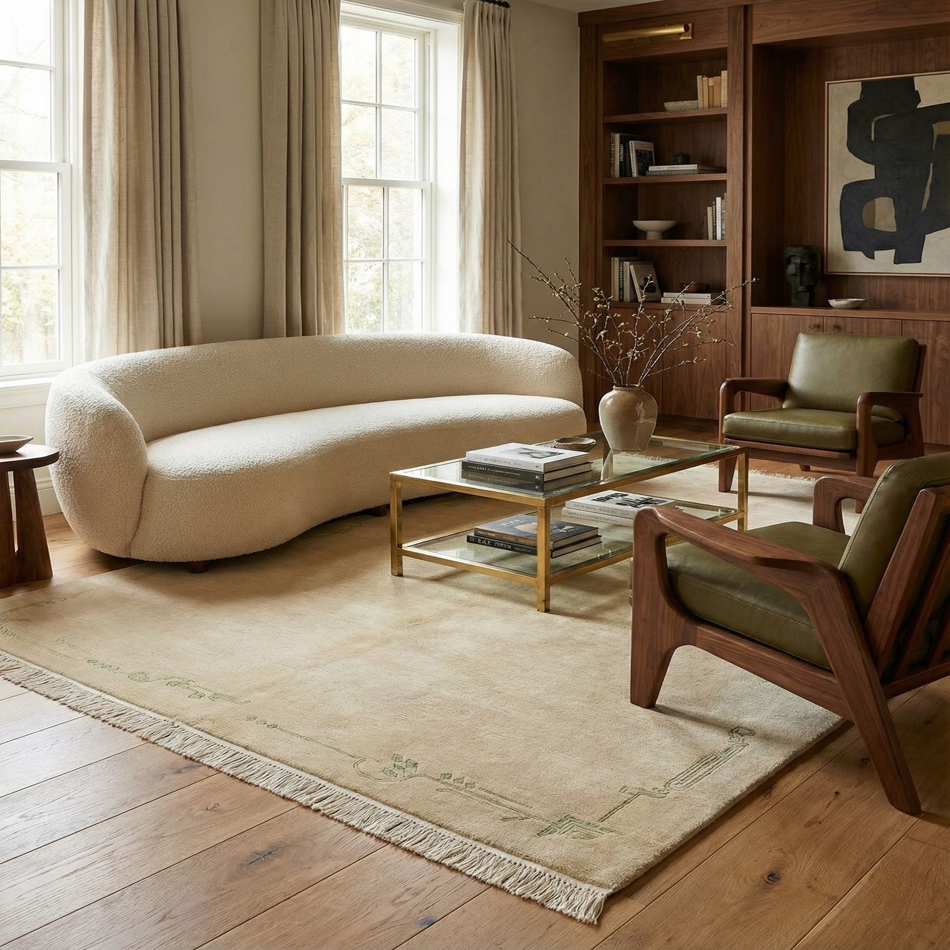 Primary color is Beige. Colors in this rug include: Beige, Blue, Green.