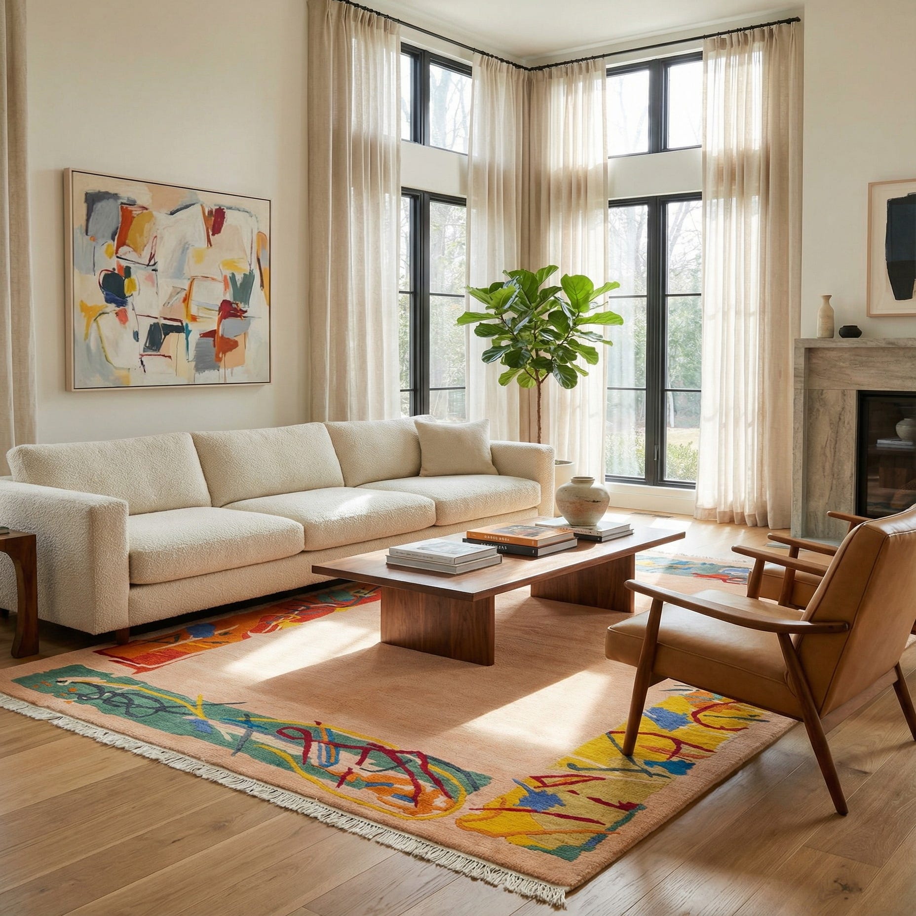 Primary color is Beige. Colors in this rug include: Beige, Blue, Navy Blue, Olive, Orange, Red, Yellow, Gray, Green.