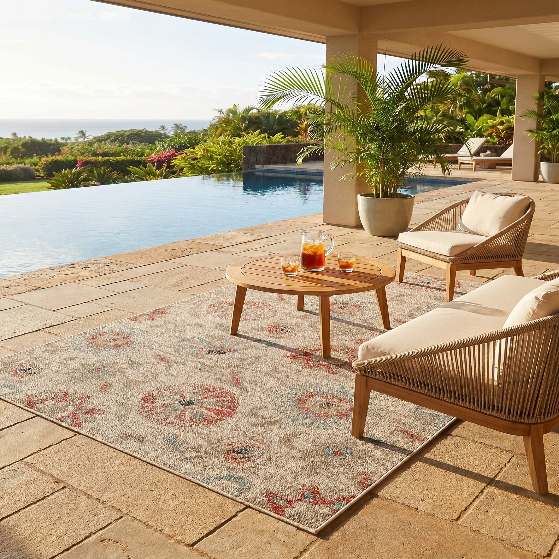 The colors harmonize perfectly with my deck and surrounding planters. The rug anchors my outdoor table. It’s already been drenched once from a soaking rain and dried out with no wrinkles. I love this rug.!