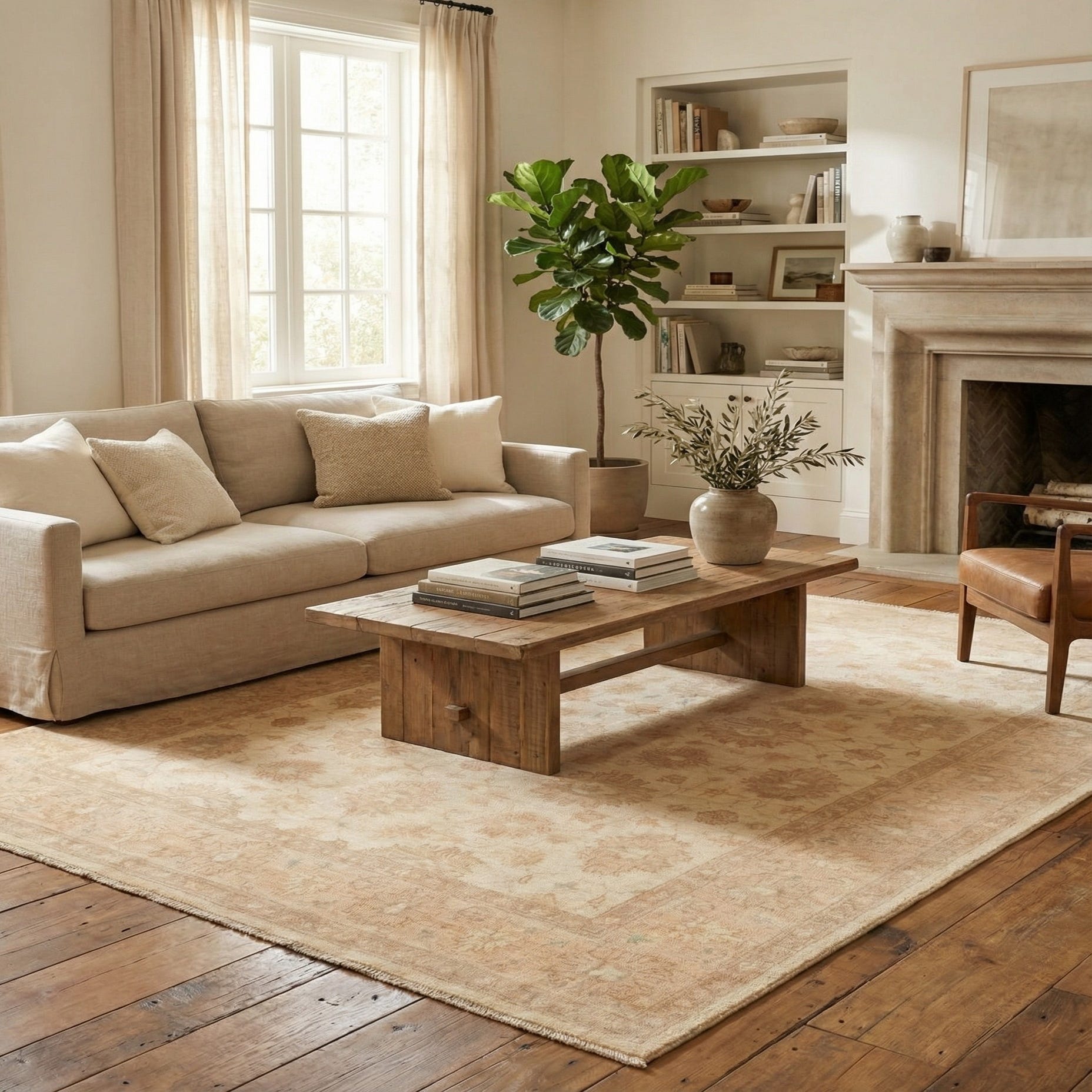 Primary color is Beige. Colors in this rug include: Beige, Brown, Light Green, Olive, Peach, Tan.
