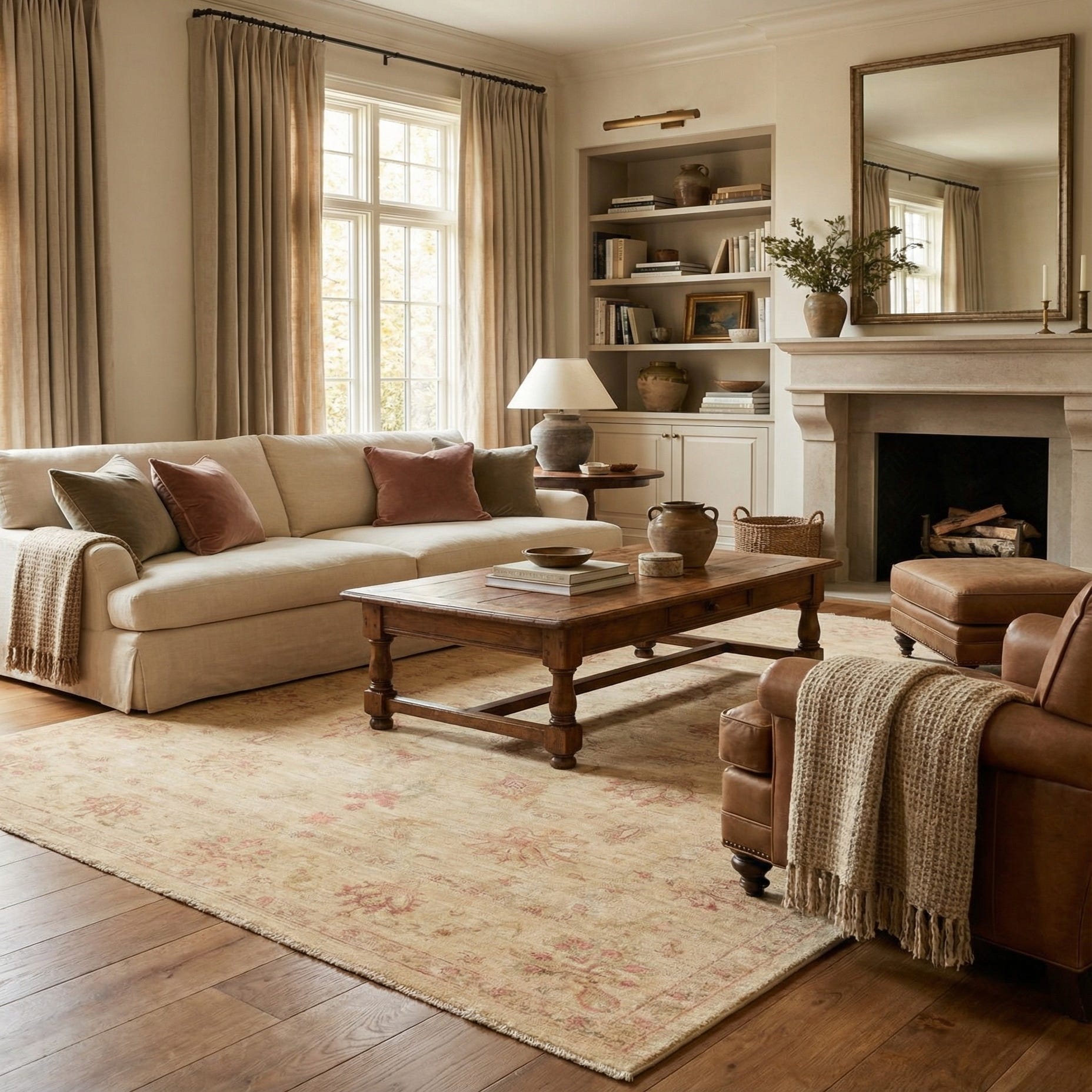 Primary color is Beige. Colors in this rug include: Beige, Brown, Cream, Green, Terracotta, Gold, Tan.