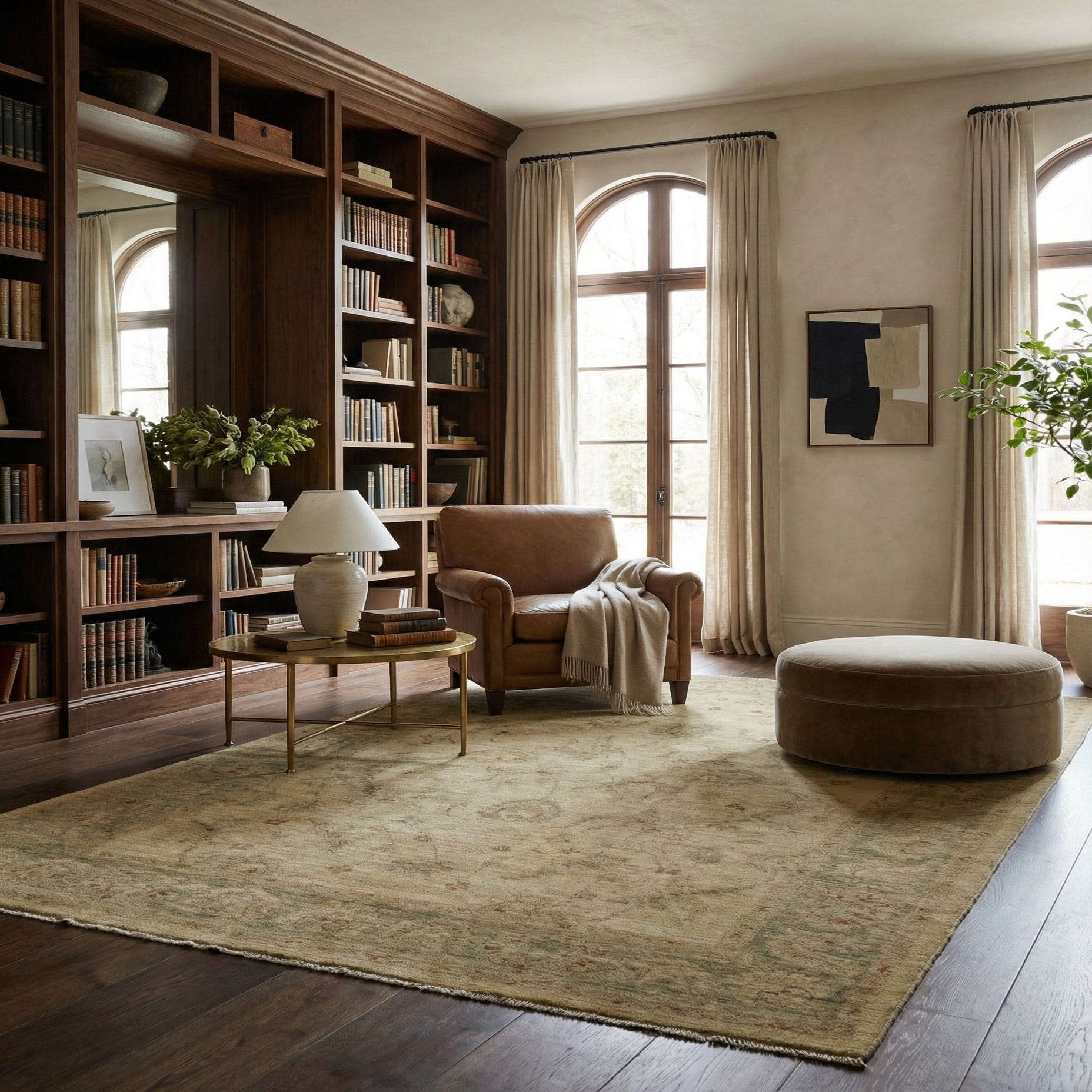 Primary color is Beige. Colors in this rug include: Beige, Brown, Olive.