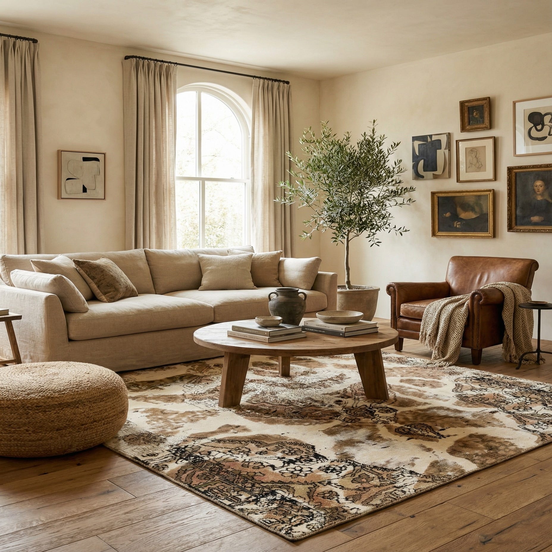 Primary color is Beige. Colors in this rug include: Beige, Brown, Light Brown, Ivory, Black.