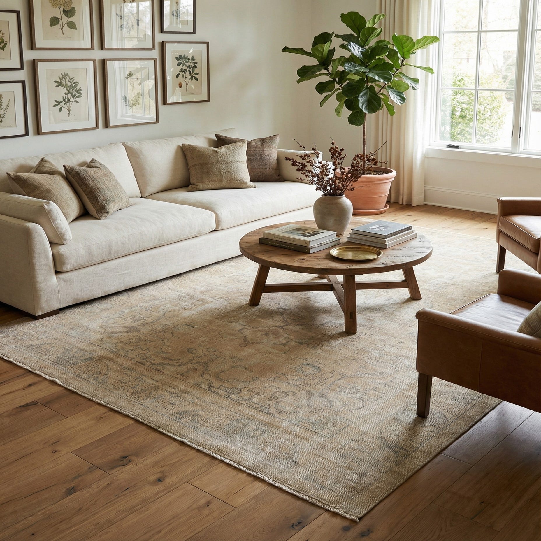 Primary color is Beige. Colors in this rug include: Beige, Brown, Green, Ivory.