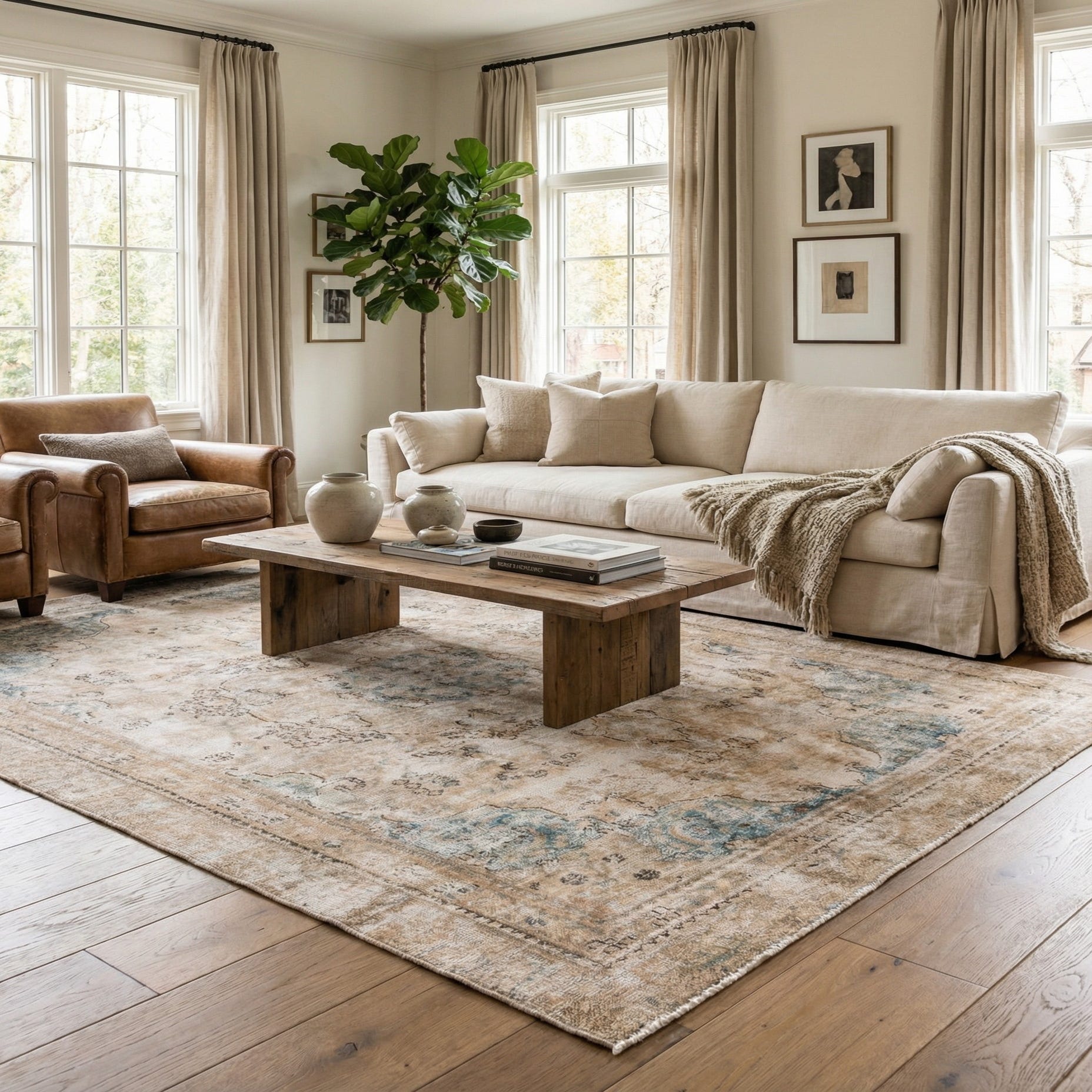 Primary color is Beige. Colors in this rug include: Beige, Brown, Ivory, Navy Blue.