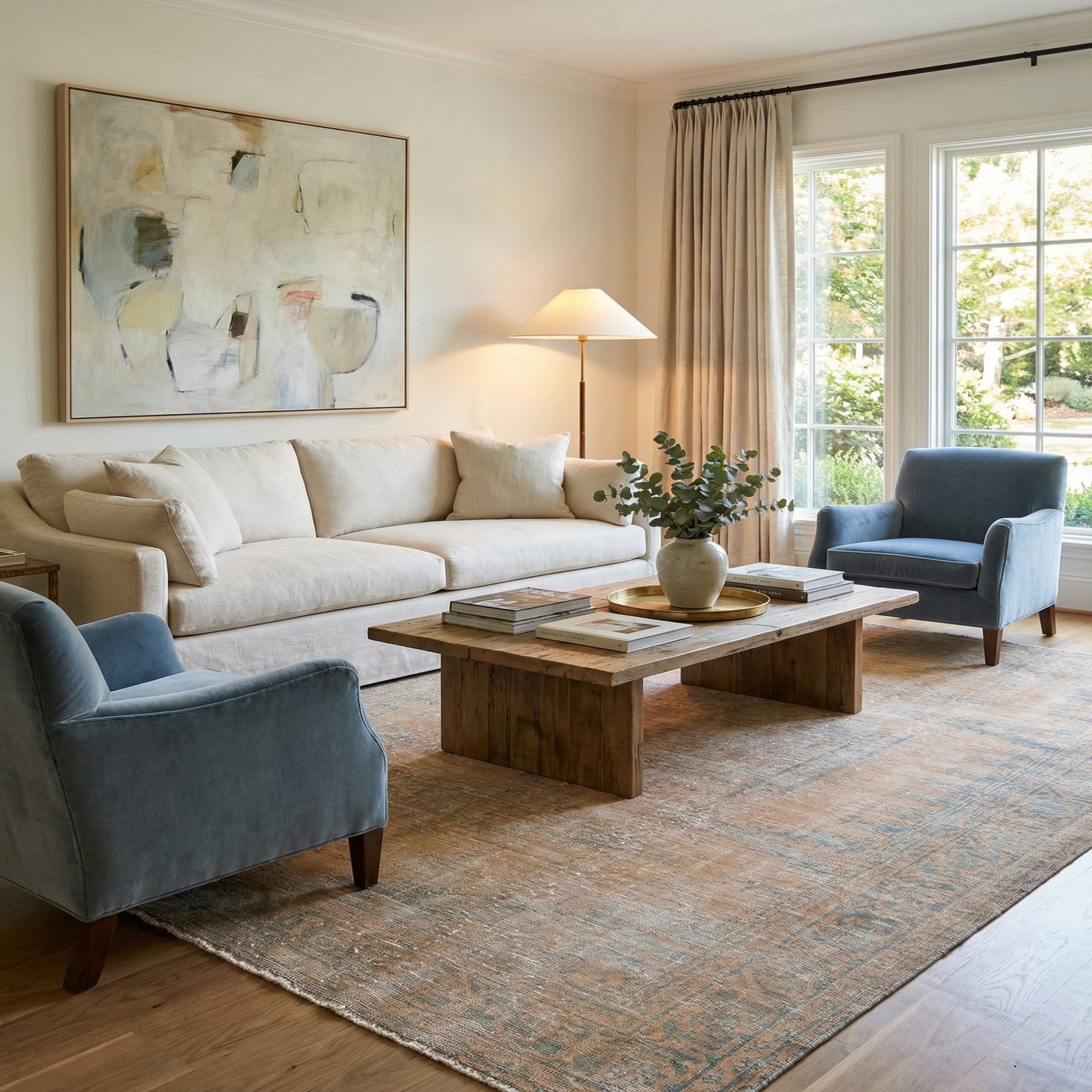 Primary color is Beige. Colors in this rug include: Beige, Ivory, Navy Blue.