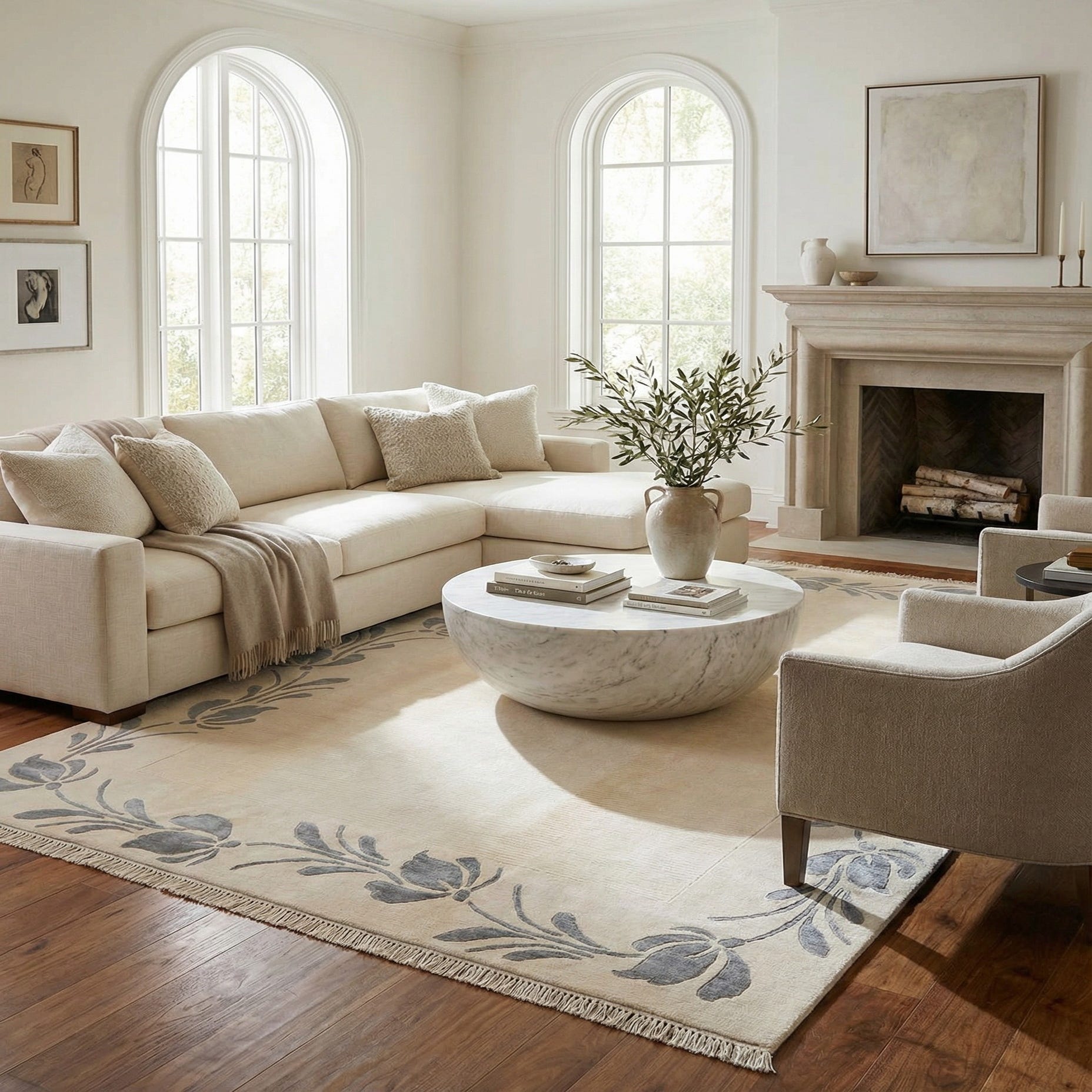 Primary color is Beige. Colors in this rug include: Beige, Gray, Silver.