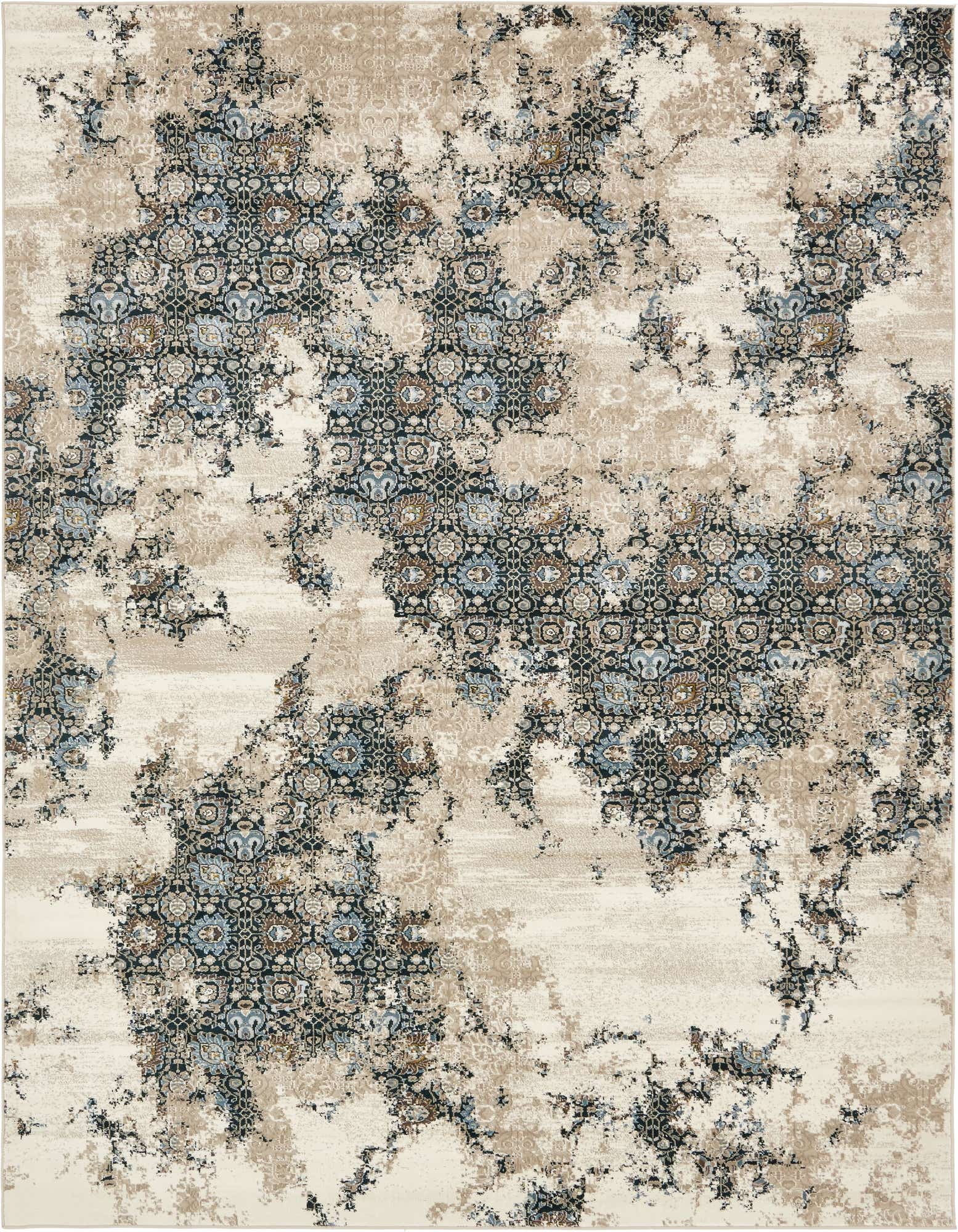 Primary color is Beige. Colors in this rug include: Beige, Brown, Gray, Light Blue, Navy Blue, Ivory.