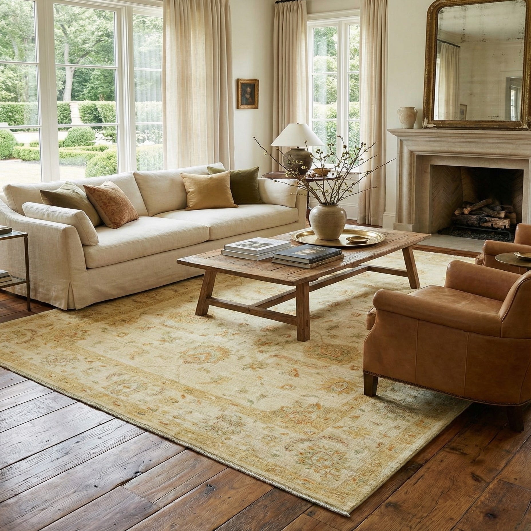 Primary color is Beige. Colors in this rug include: Beige, Blue, Brown, Gold, Rust Red, Olive.