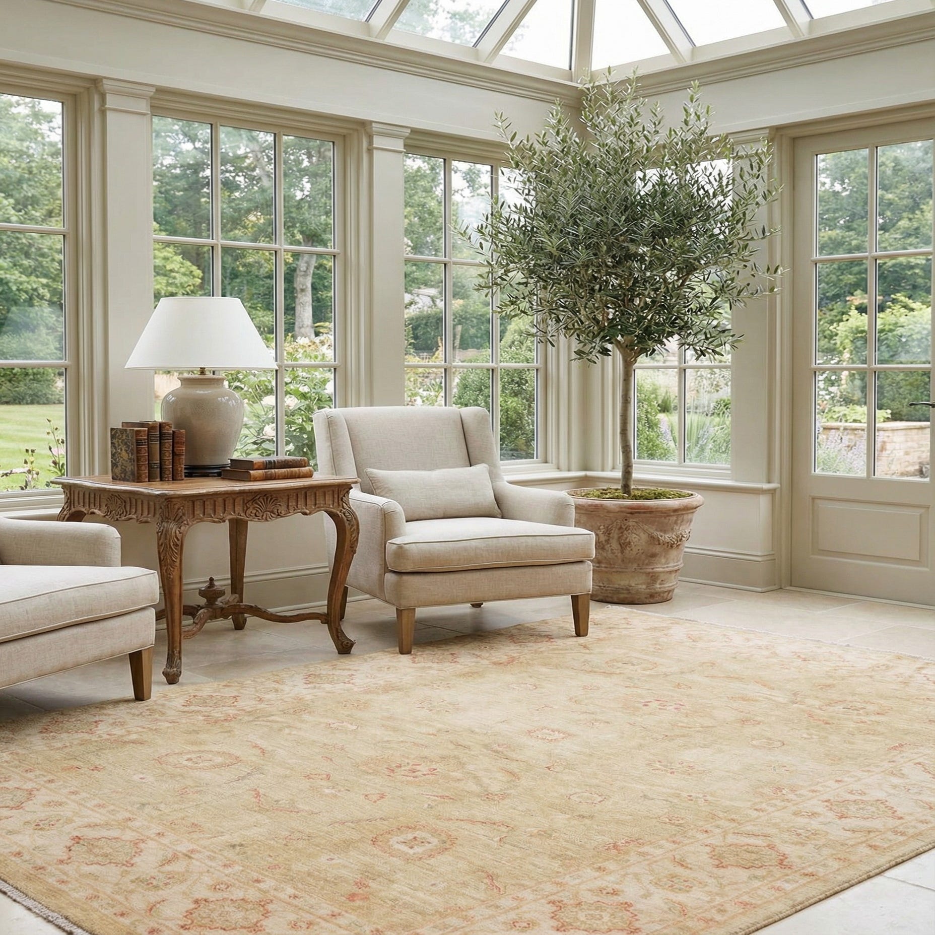 Primary color is Beige. Colors in this rug include: Beige, Cream, Light Green, Terracotta, Gold, Olive.