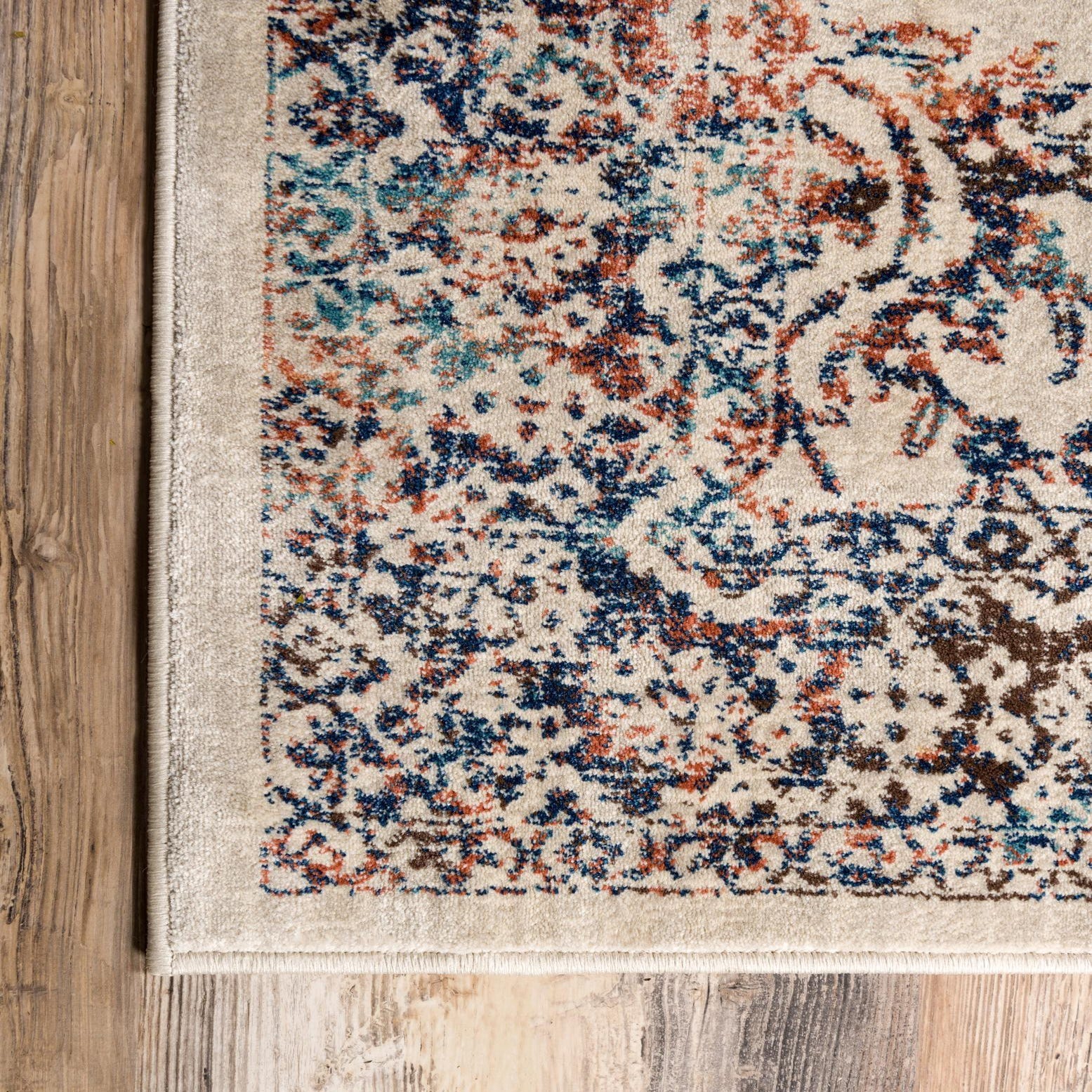 Primary color is Beige. Colors in this rug include: Beige, Blue, Brown, Navy Blue, Orange, Red, Yellow.