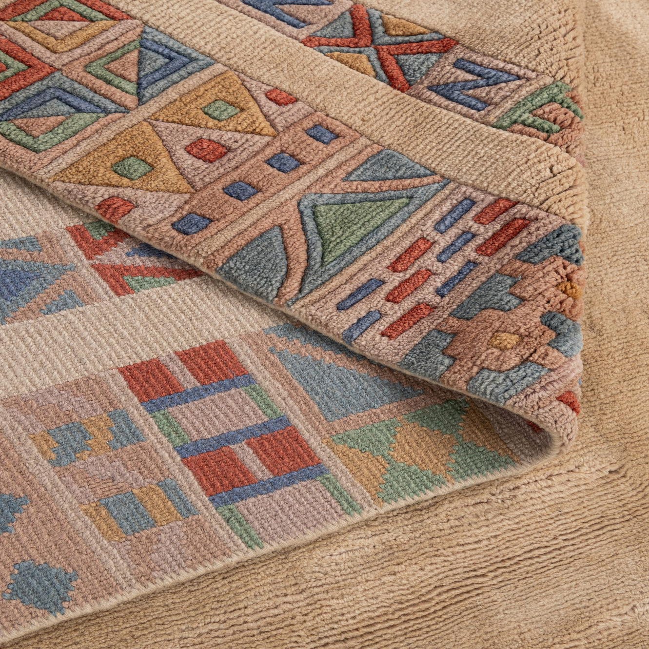 Primary color is Beige. Colors in this rug include: Beige, Blue, Brown, Gray, Green, Red, Light Brown.