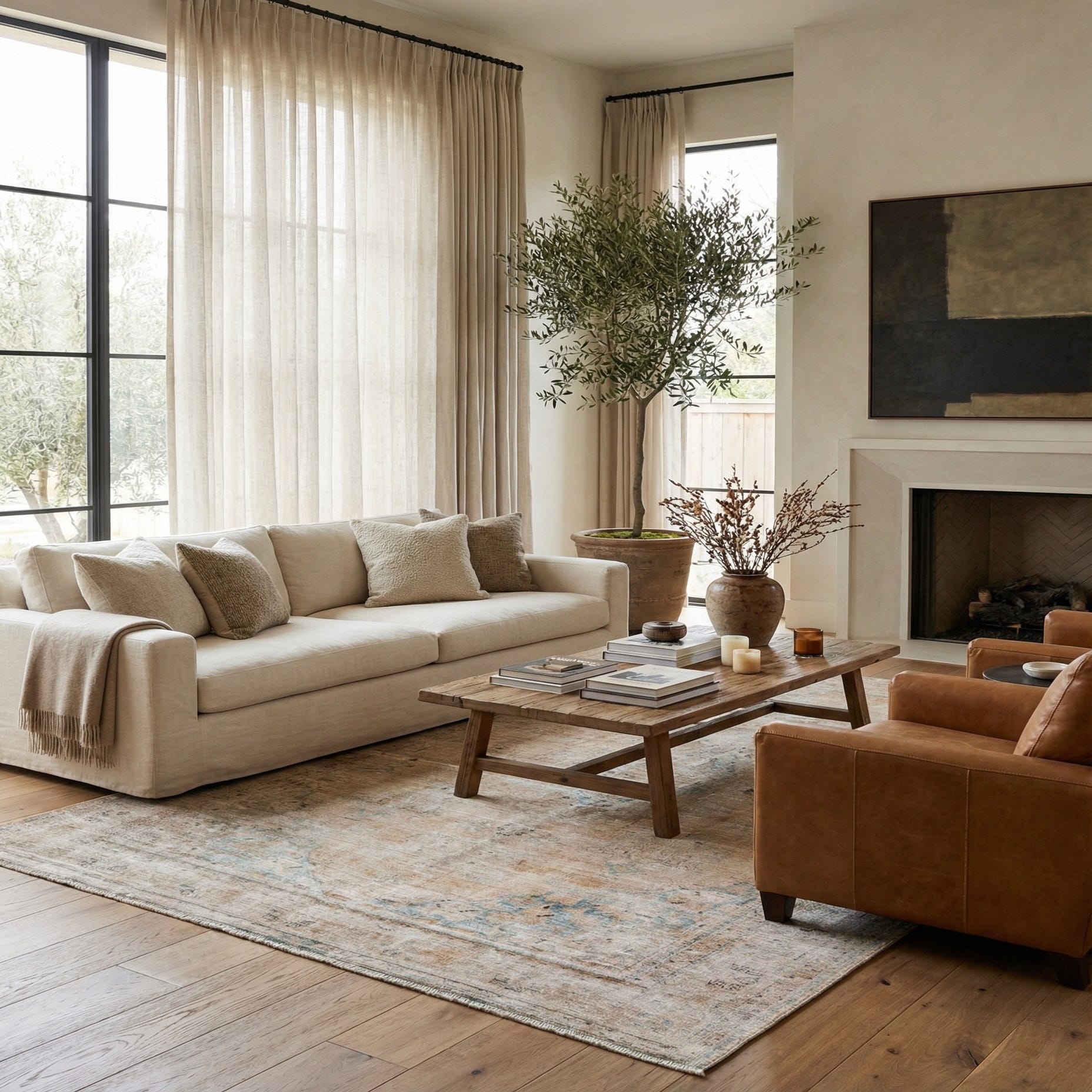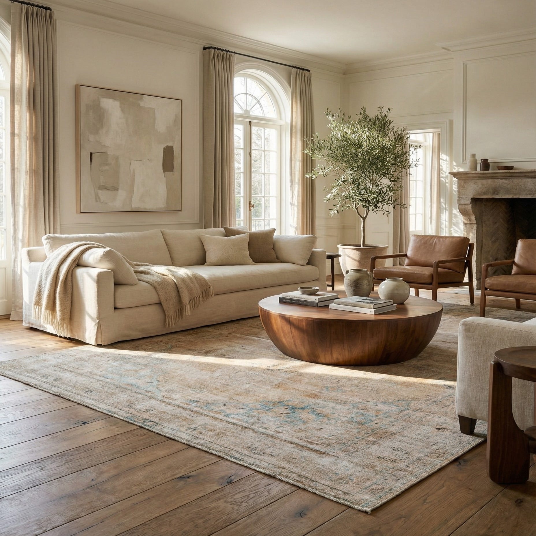 Primary color is Beige. Colors in this rug include: Beige, Brown, Navy Blue.