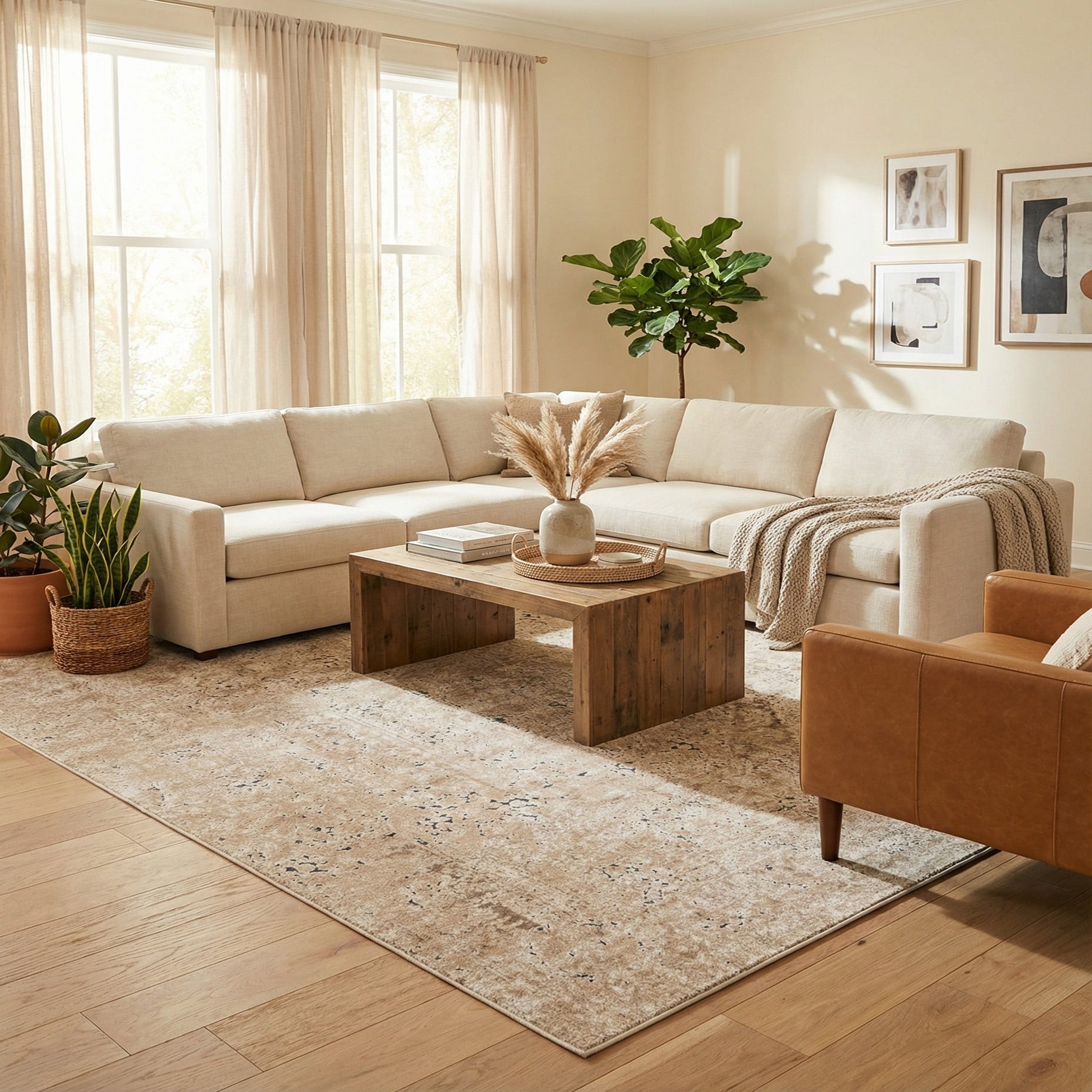 Primary color is Beige. Colors in this rug include: Beige, Brown, Navy Blue.