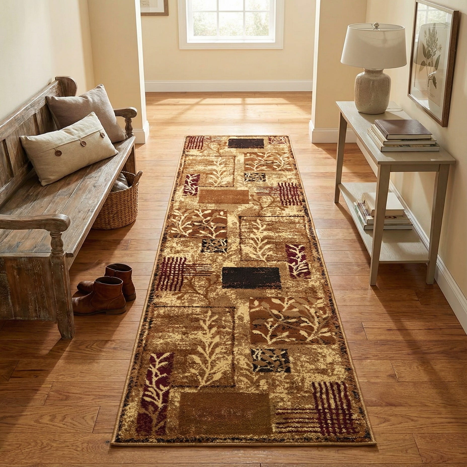 Primary color is Beige. Colors in this rug include: Beige, Brown, Burgundy, Cream, Light Brown, Maroon.