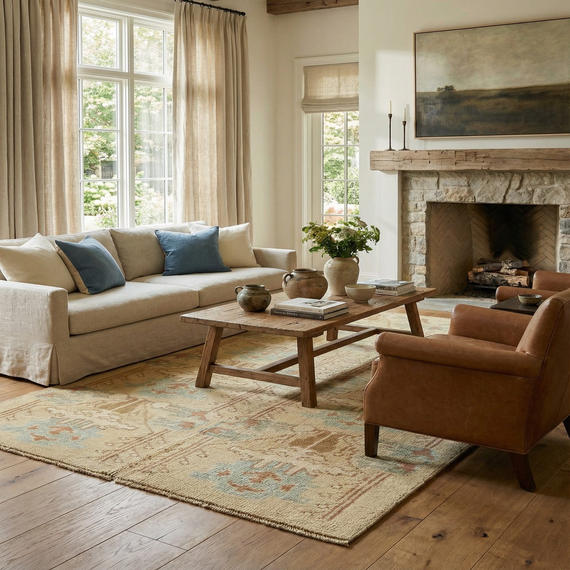 Primary color is Beige. Colors in this rug include: Beige, Brown, Light Blue, Ivory, Olive, Peach.