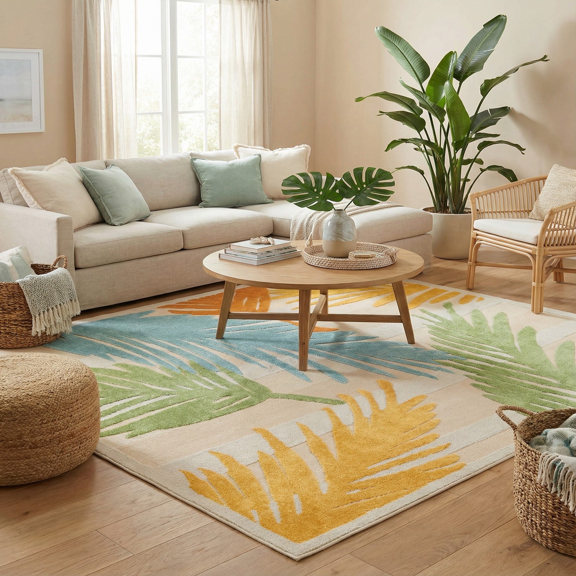 Primary color is Beige. Colors in this rug include: Beige, Green, Light Blue, Yellow, Orange.