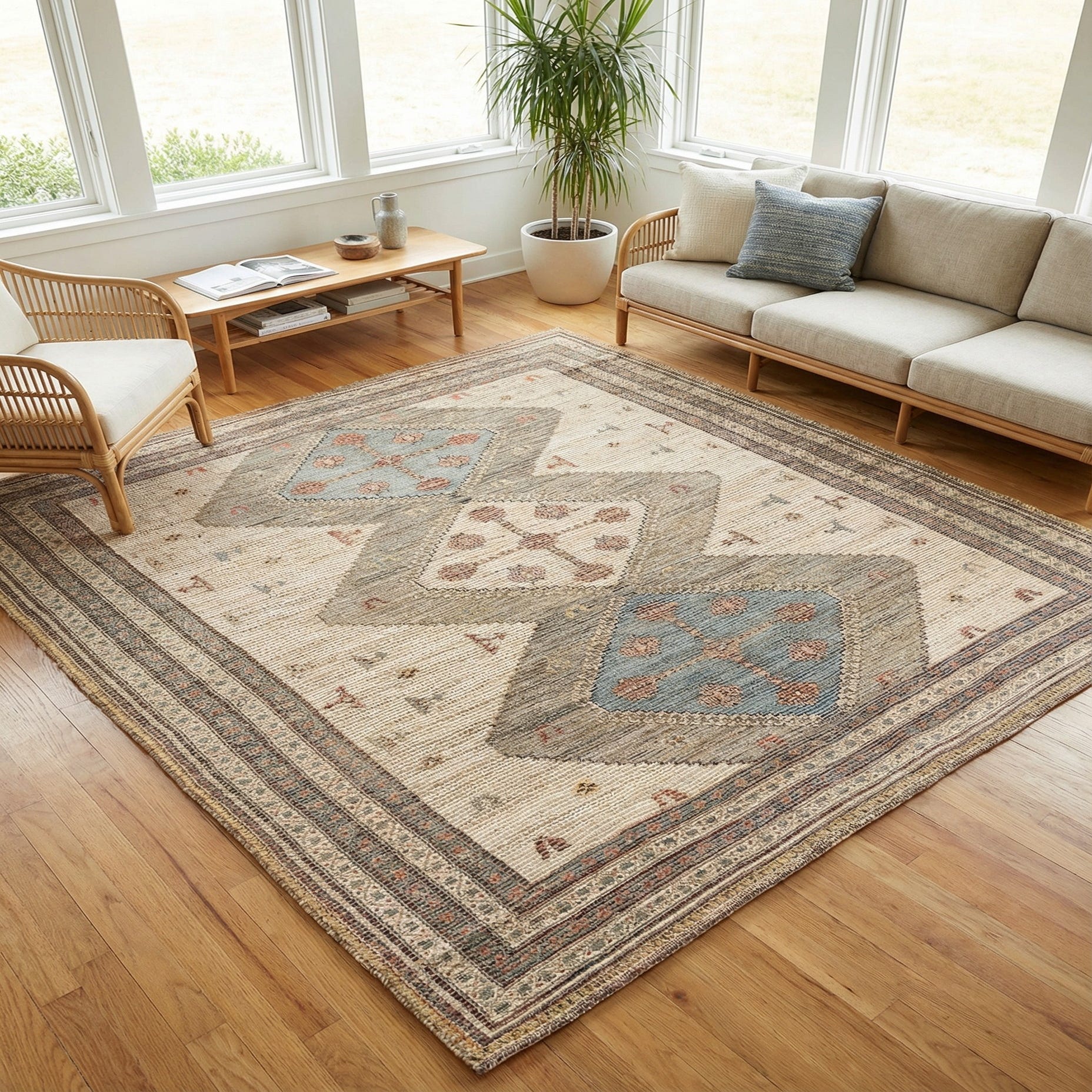 Primary color is Beige. Colors in this rug include: Beige, Gray.