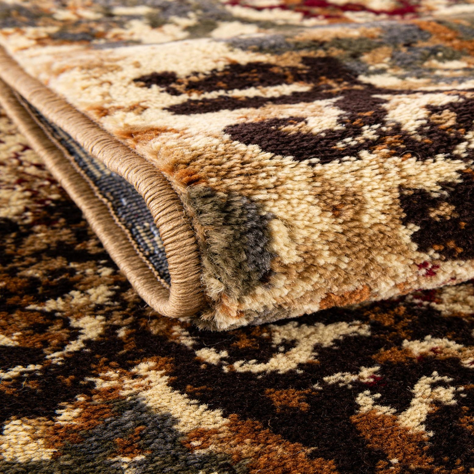 Primary color is Beige. Colors in this rug include: Beige, Blue, Brown, Burgundy, Gray, Olive.