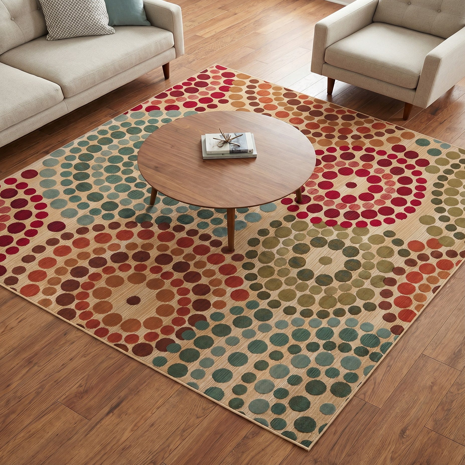 I'm very pleased with my purchase! I needed to match existing cushions and pillows and this rug was very true to color! It's the right blend of color while be cheerful and relaxing!