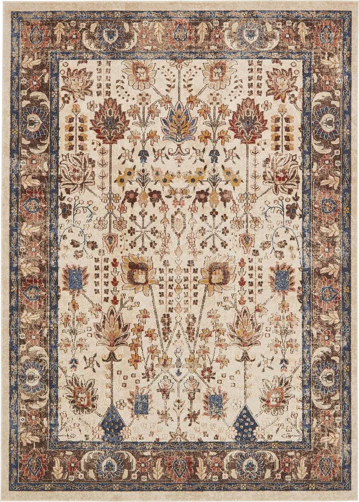 Primary color is Beige. Colors in this rug include: Beige, Blue, Brown, Burgundy, Light Brown, Navy Blue, Tan, Salmon.