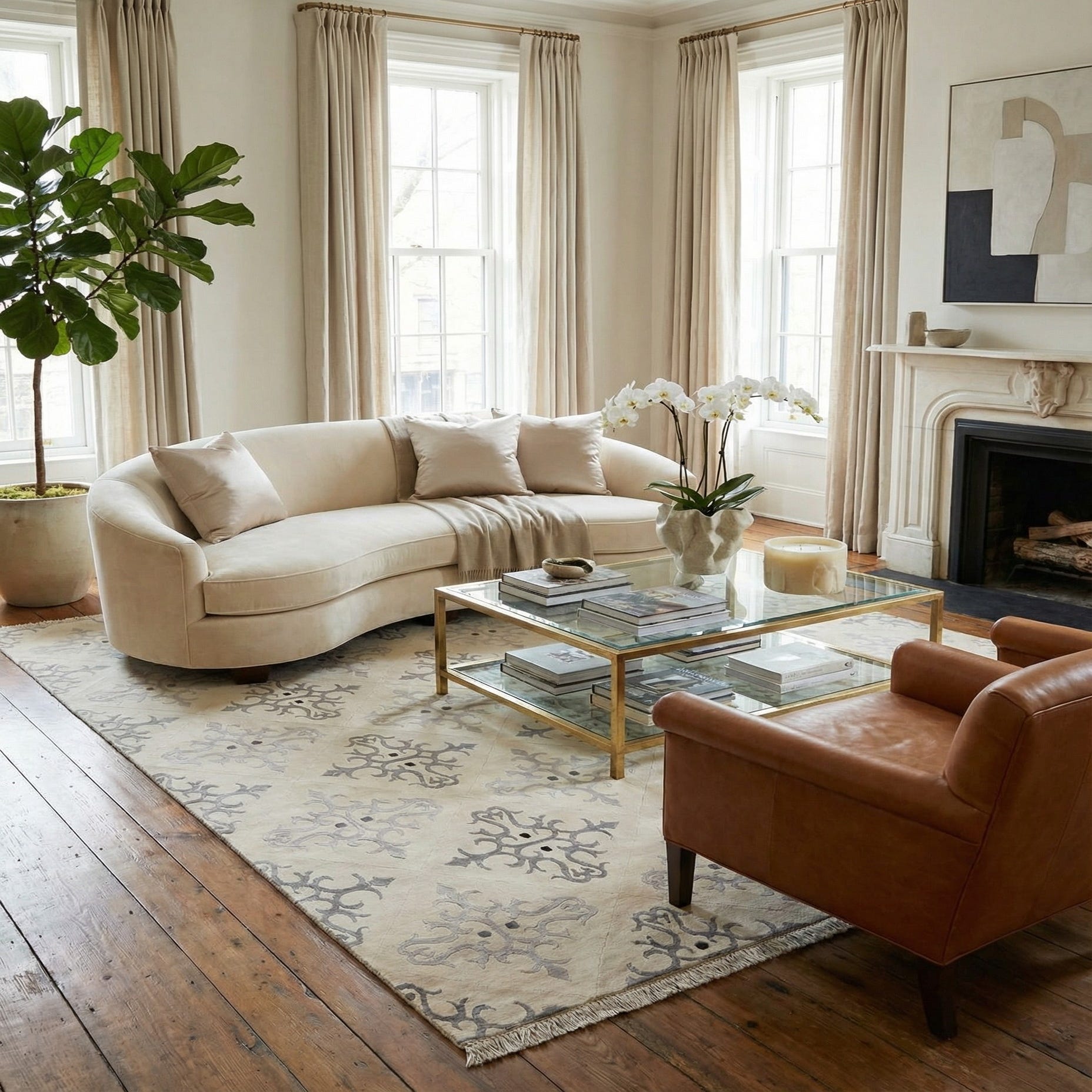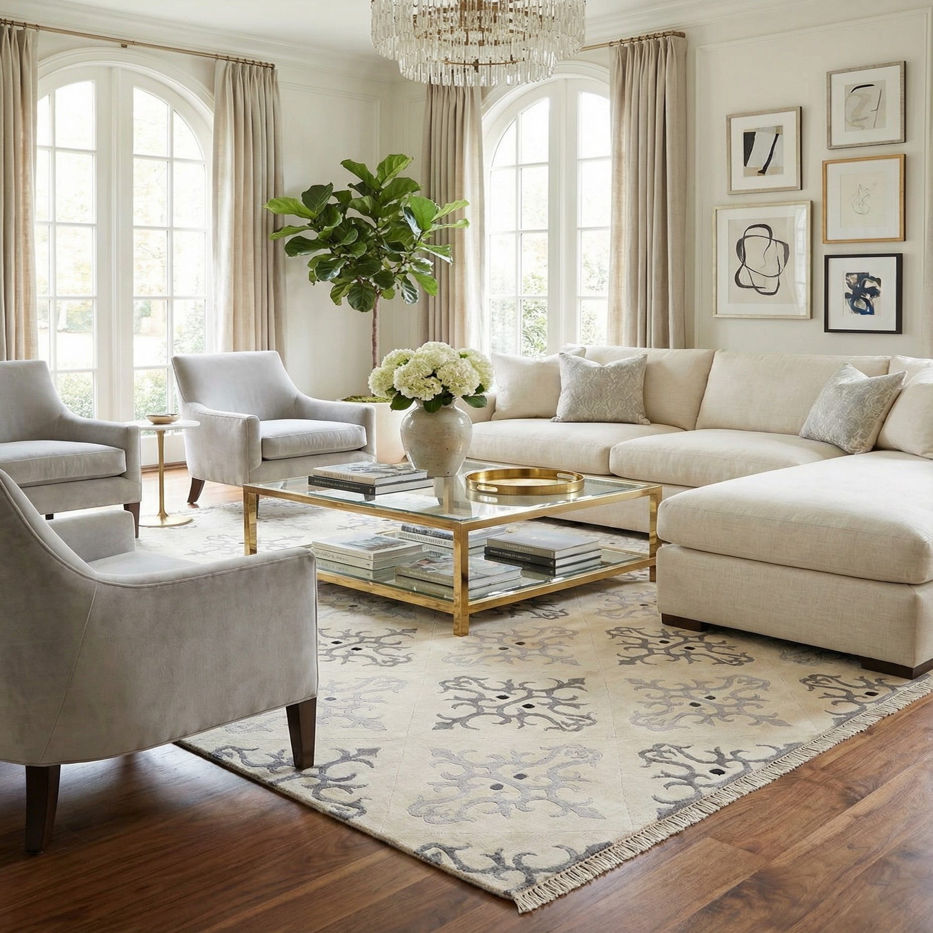 Primary color is Beige. Colors in this rug include: Beige, Black, Ivory, Silver.