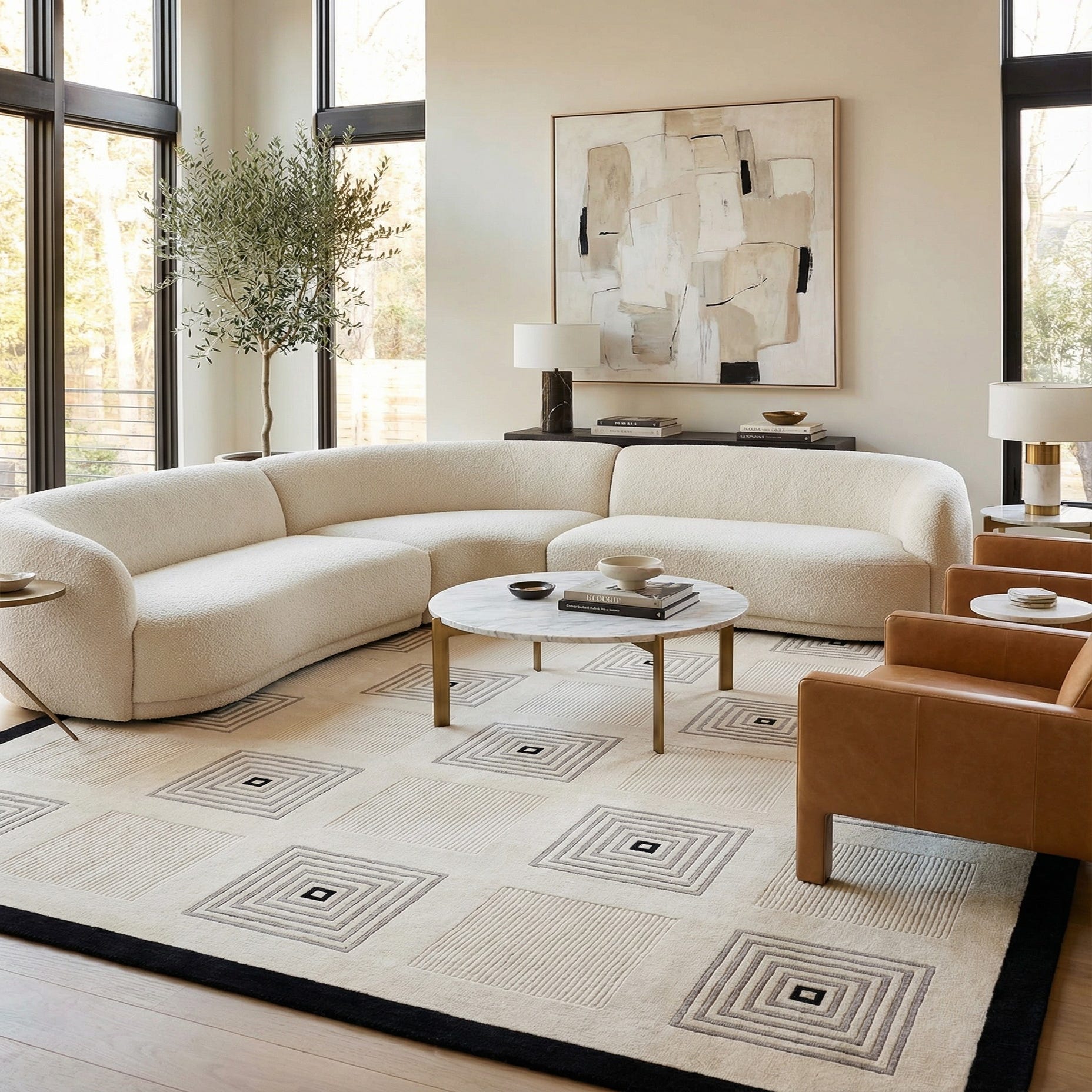 Primary color is Beige. Colors in this rug include: Beige, Black, Ivory, Tan, Silver.