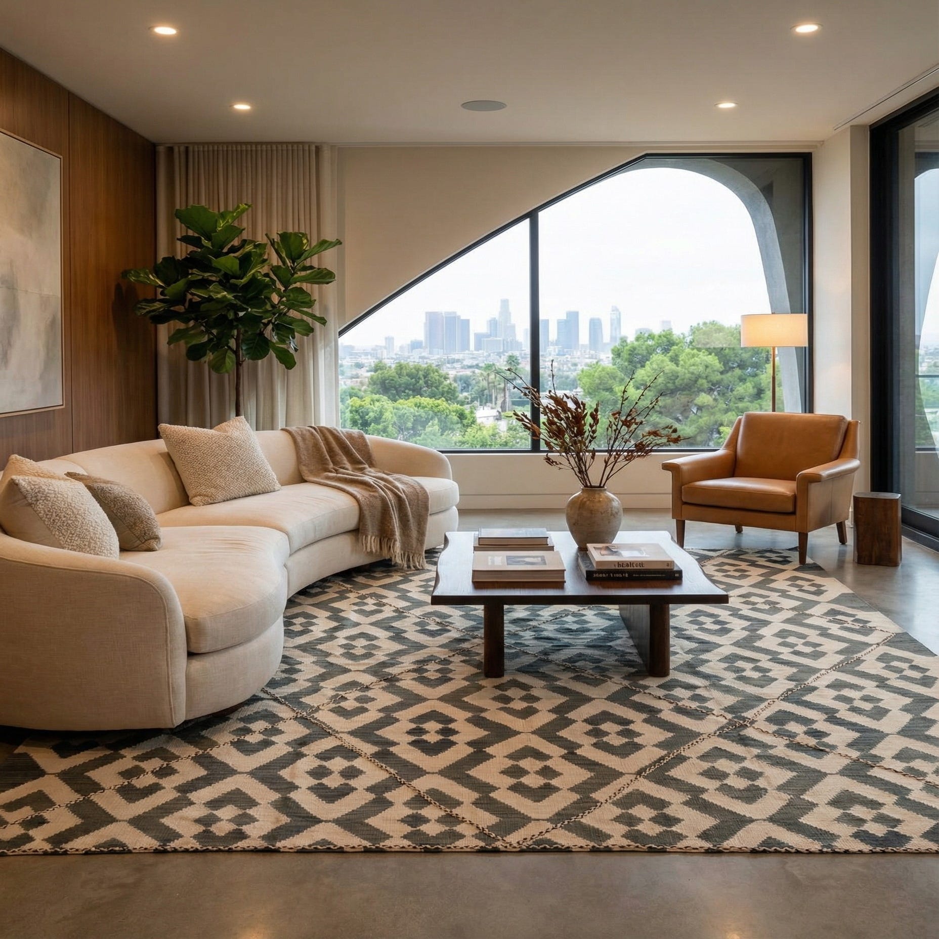 Primary color is Beige. Colors in this rug include: Beige, Black.