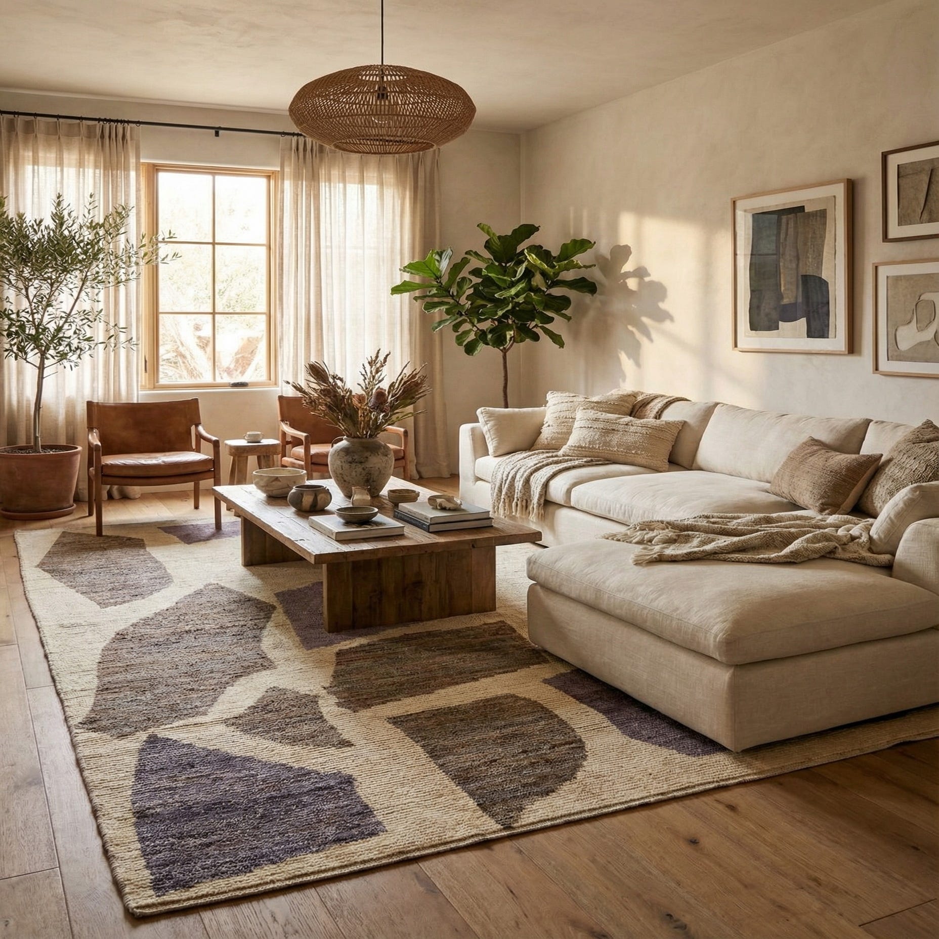 Primary color is Beige. Colors in this rug include: Beige, Brown, Purple, Ivory.