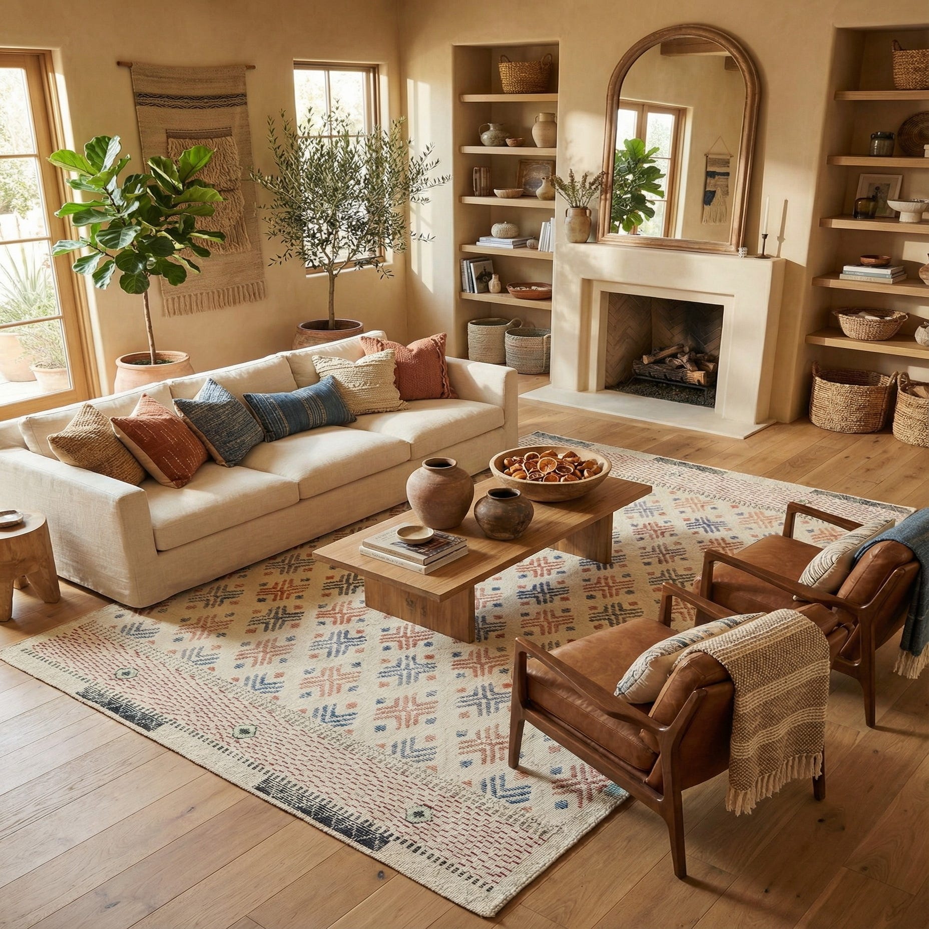 Primary color is Beige. Colors in this rug include: Beige, Terracotta, Navy Blue, Light Blue, Brown.