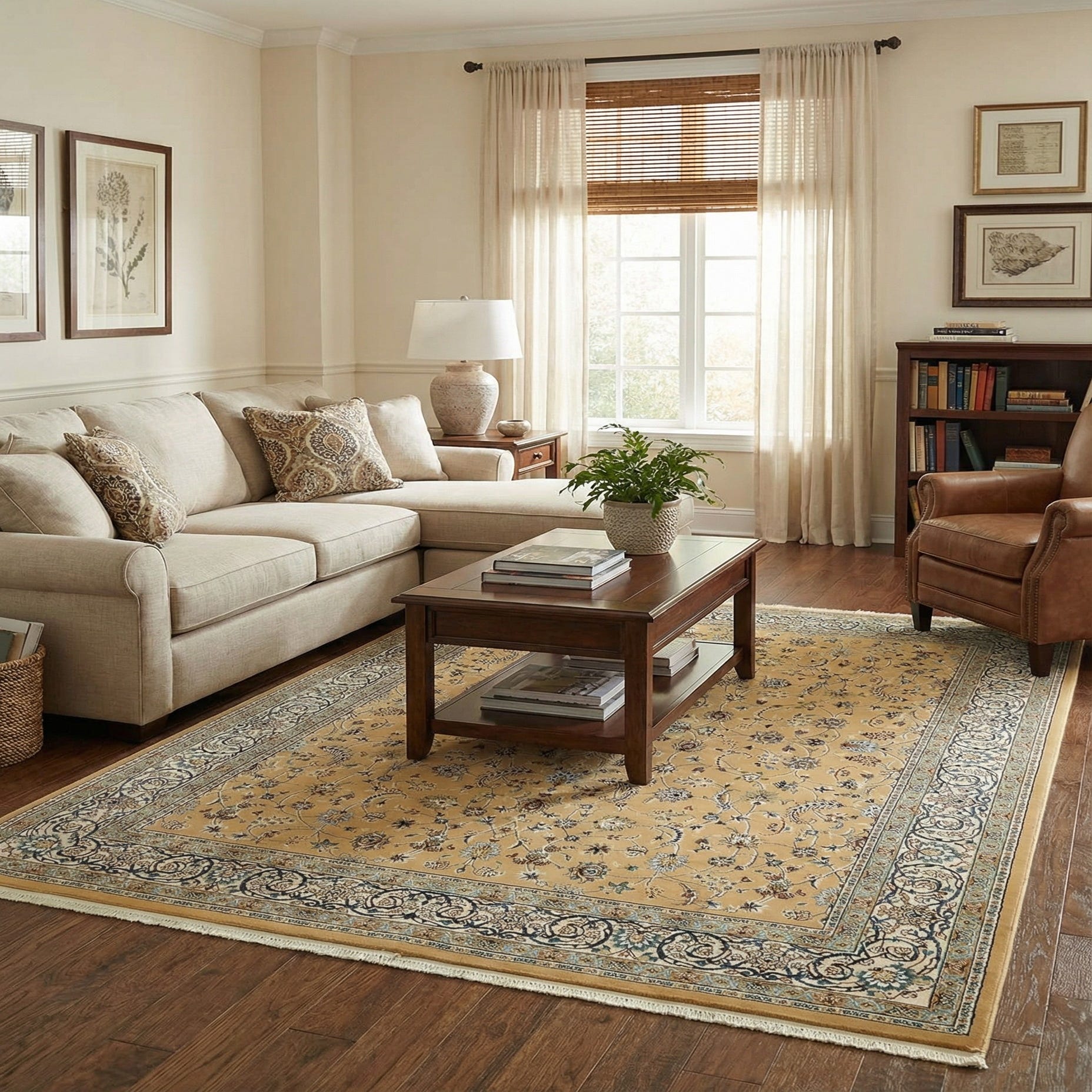 Primary color is Beige. Colors in this rug include: Beige, Blue, Burgundy, Cream, Green, Ivory, Navy Blue, Puce.