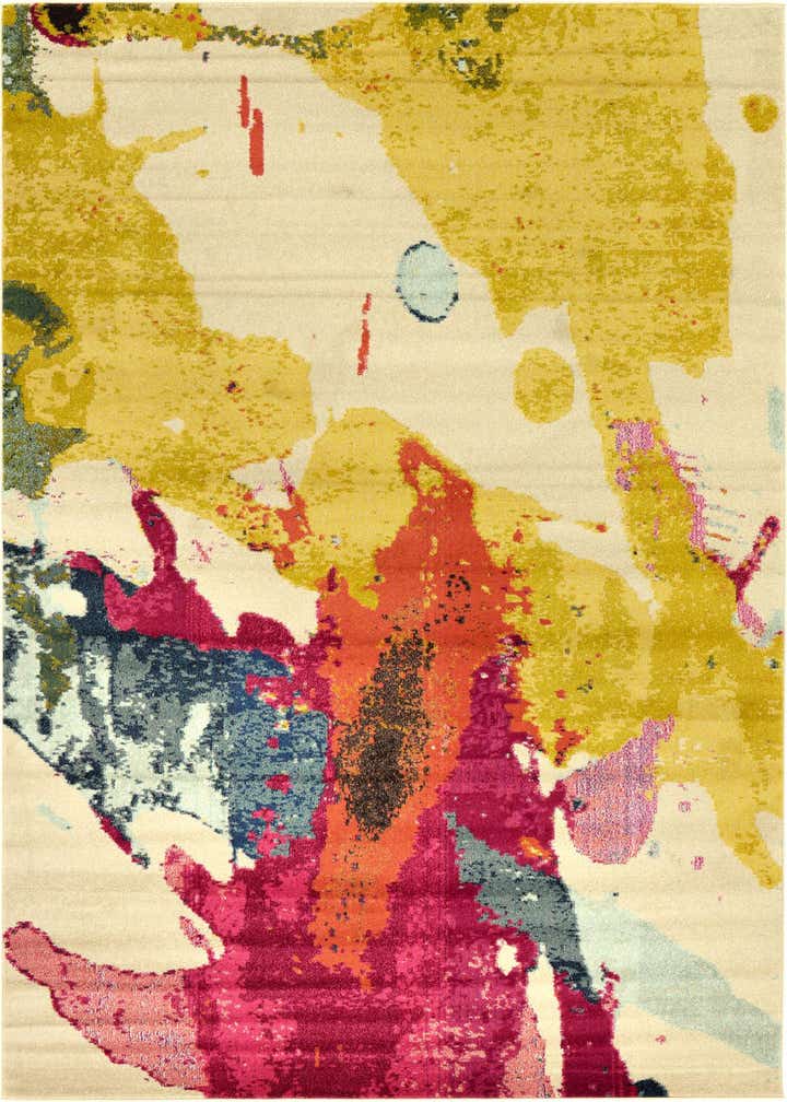 Primary color is Beige. Colors in this rug include: Beige, Cream, Gold, Navy Blue, Orange, Yellow, Violet, Pink, Light Blue.