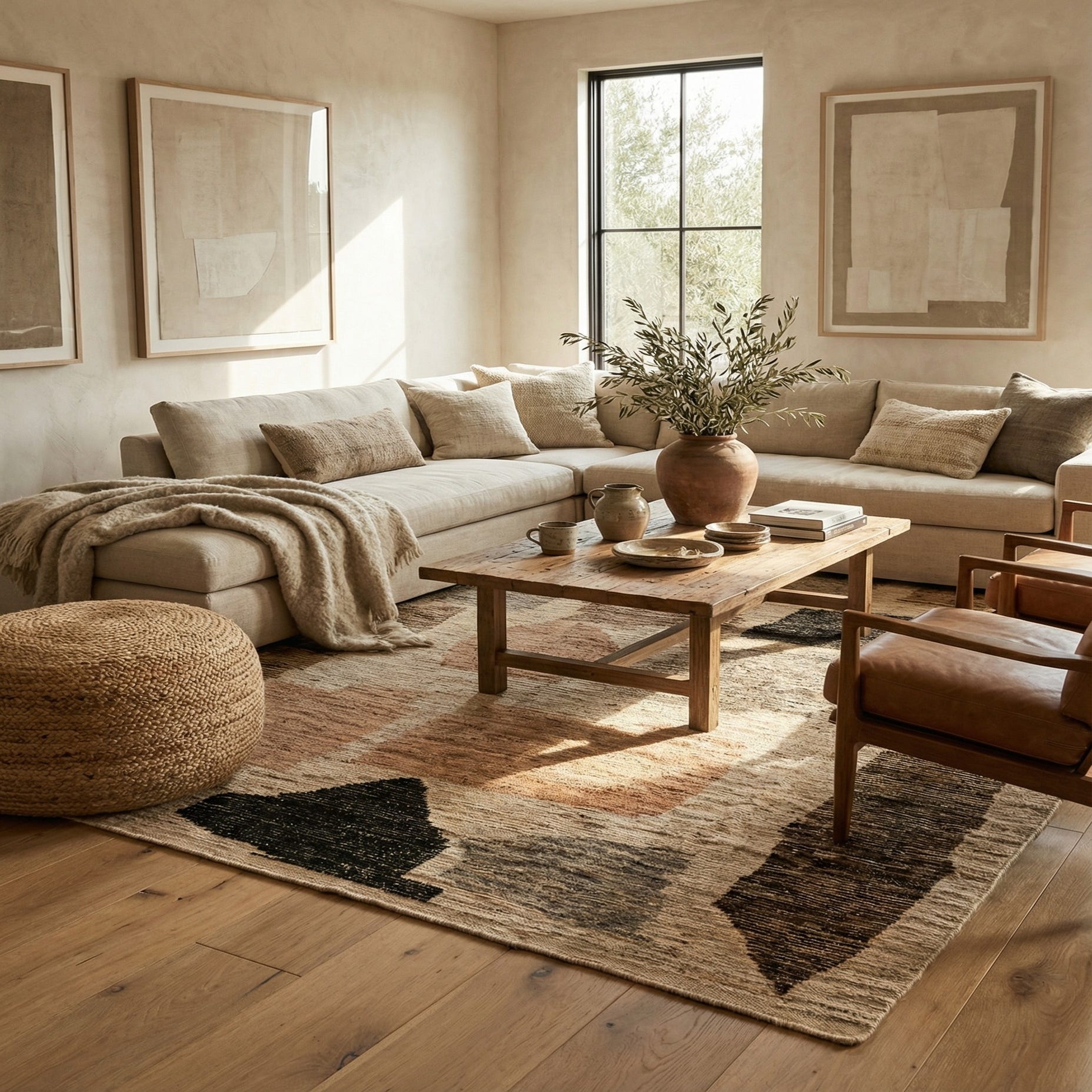 Primary color is Beige. Colors in this rug include: Beige, Black, Brown, Gray, Light Brown, Maroon.