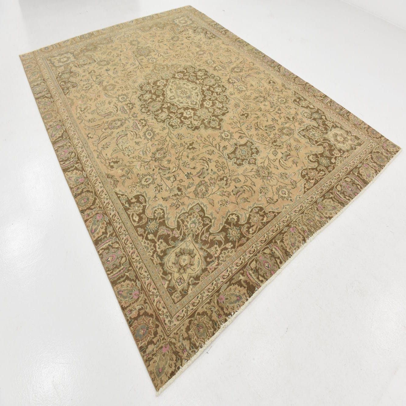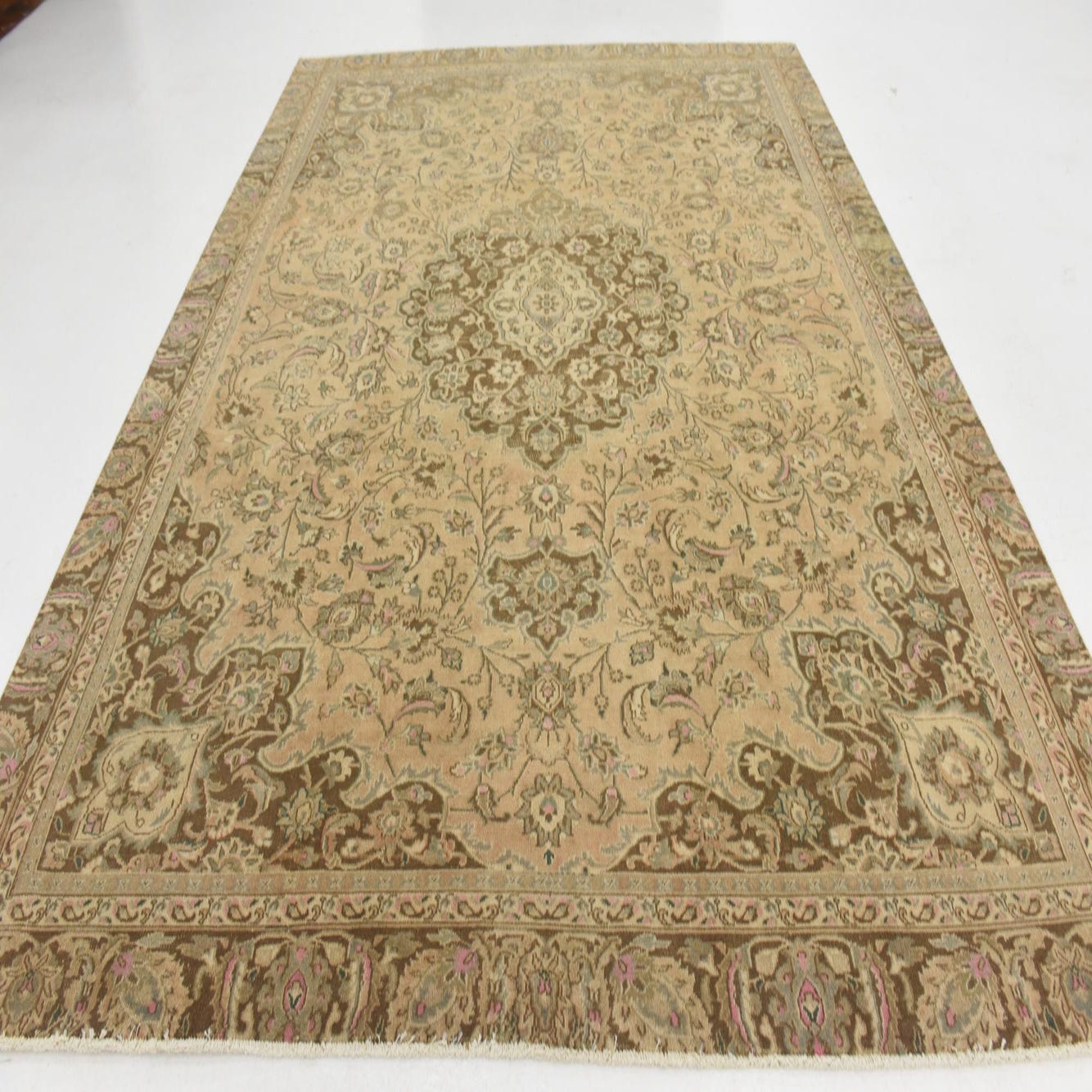 Primary color is Beige. Colors in this rug include: Beige, Brown, Light Green, Pink, Puce, Tan, Ivory.