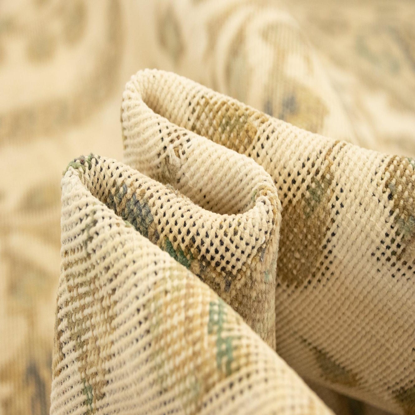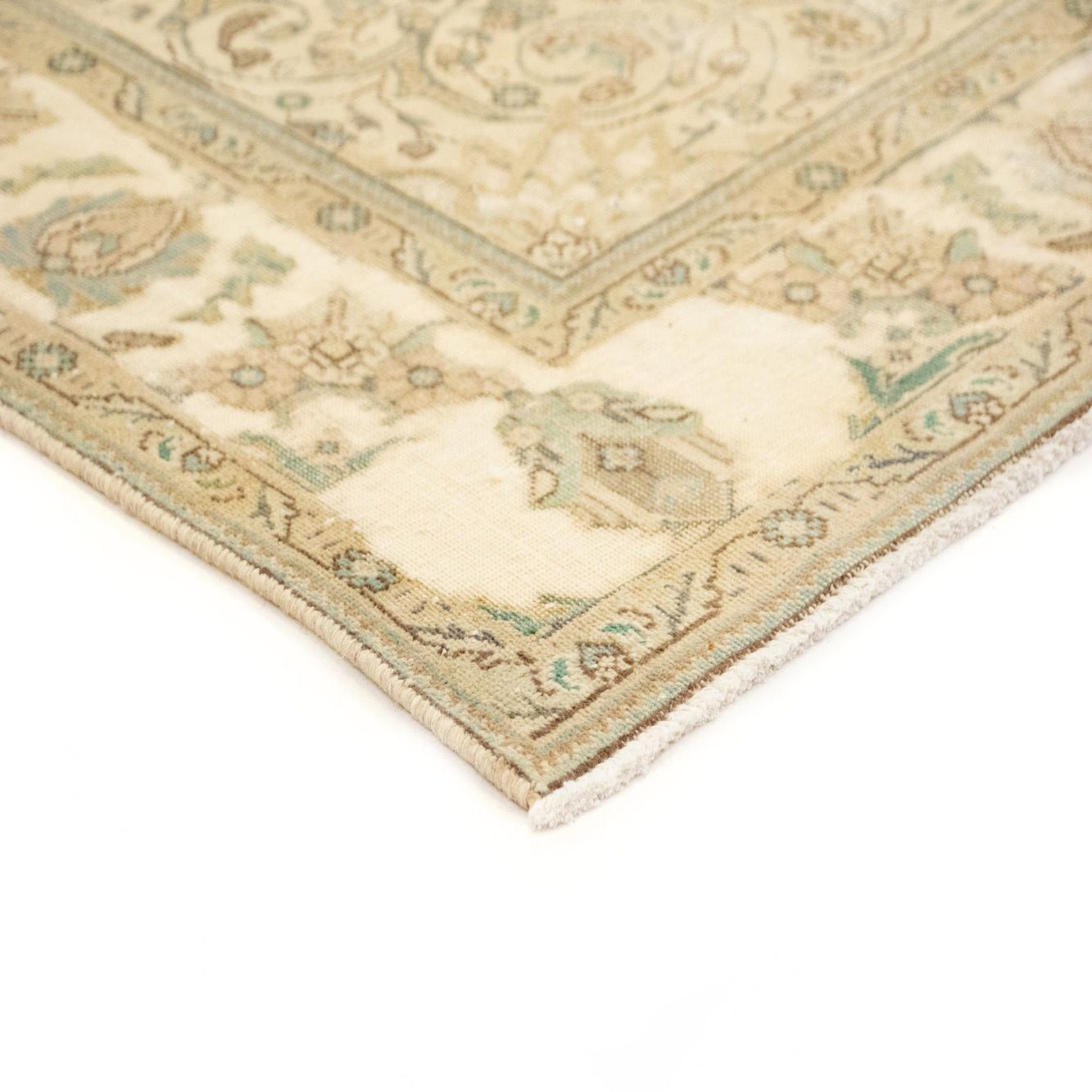 Primary color is Beige. Colors in this rug include: Beige, Green, Brown, Cream.