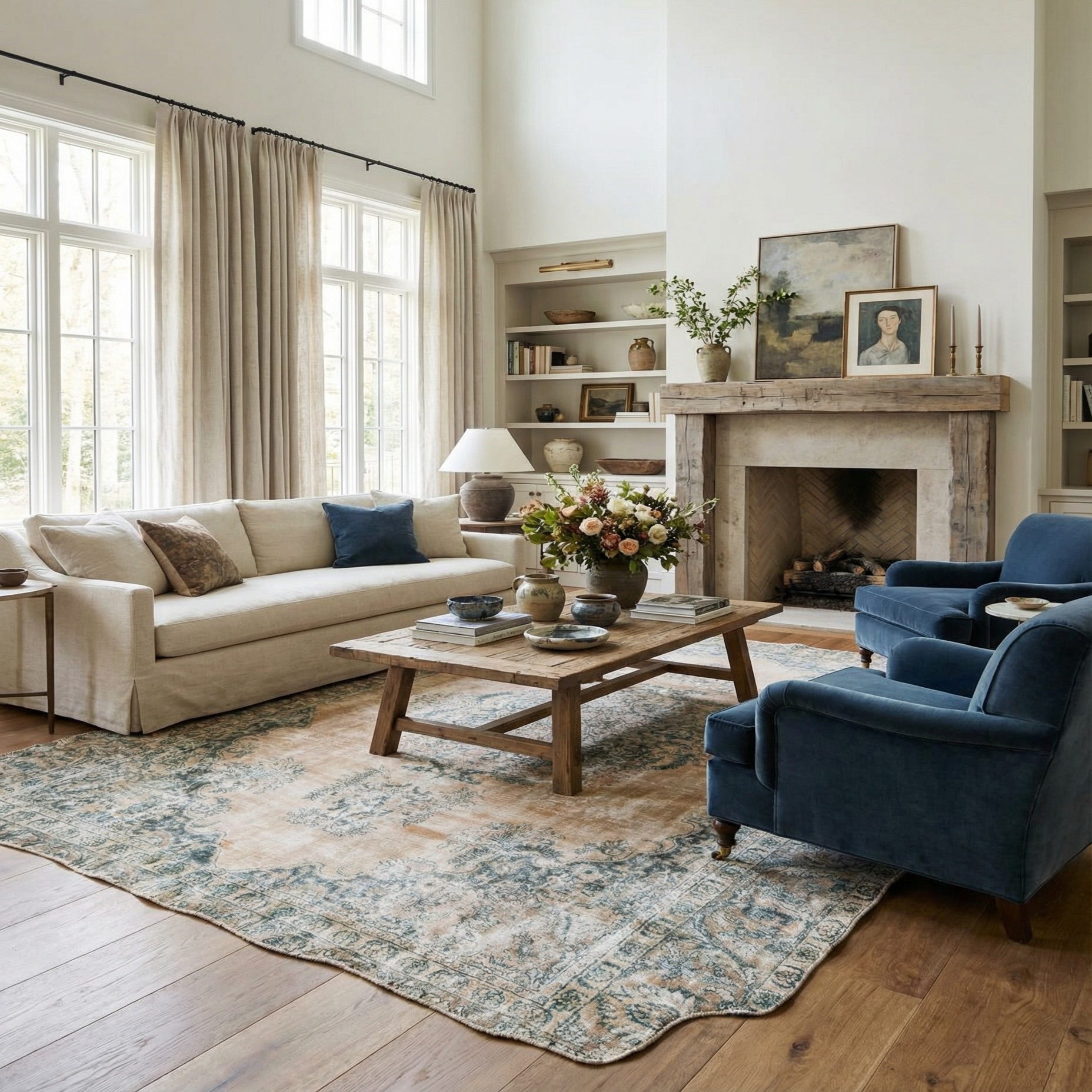 Primary color is Beige. Colors in this rug include: Beige, Brown, Navy Blue, Ivory.