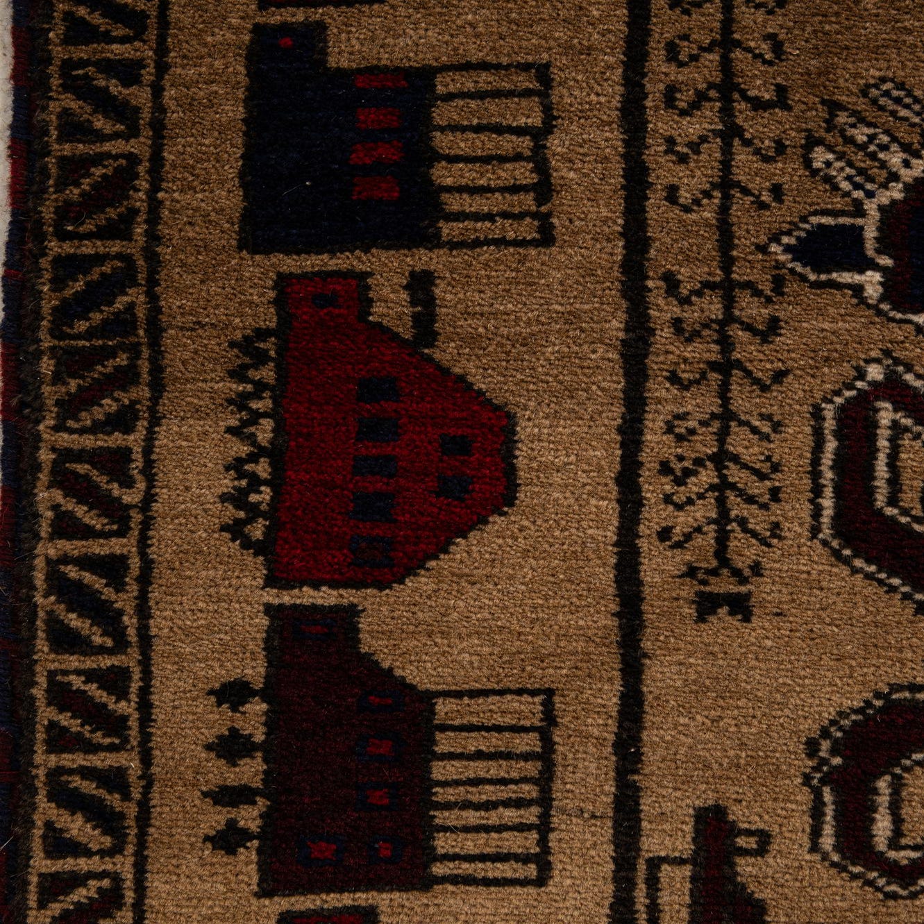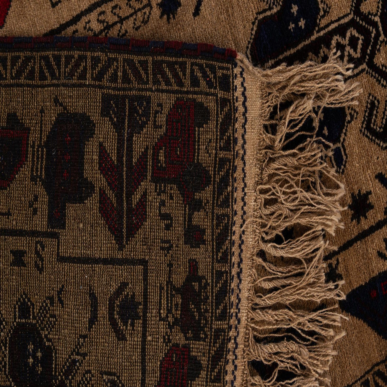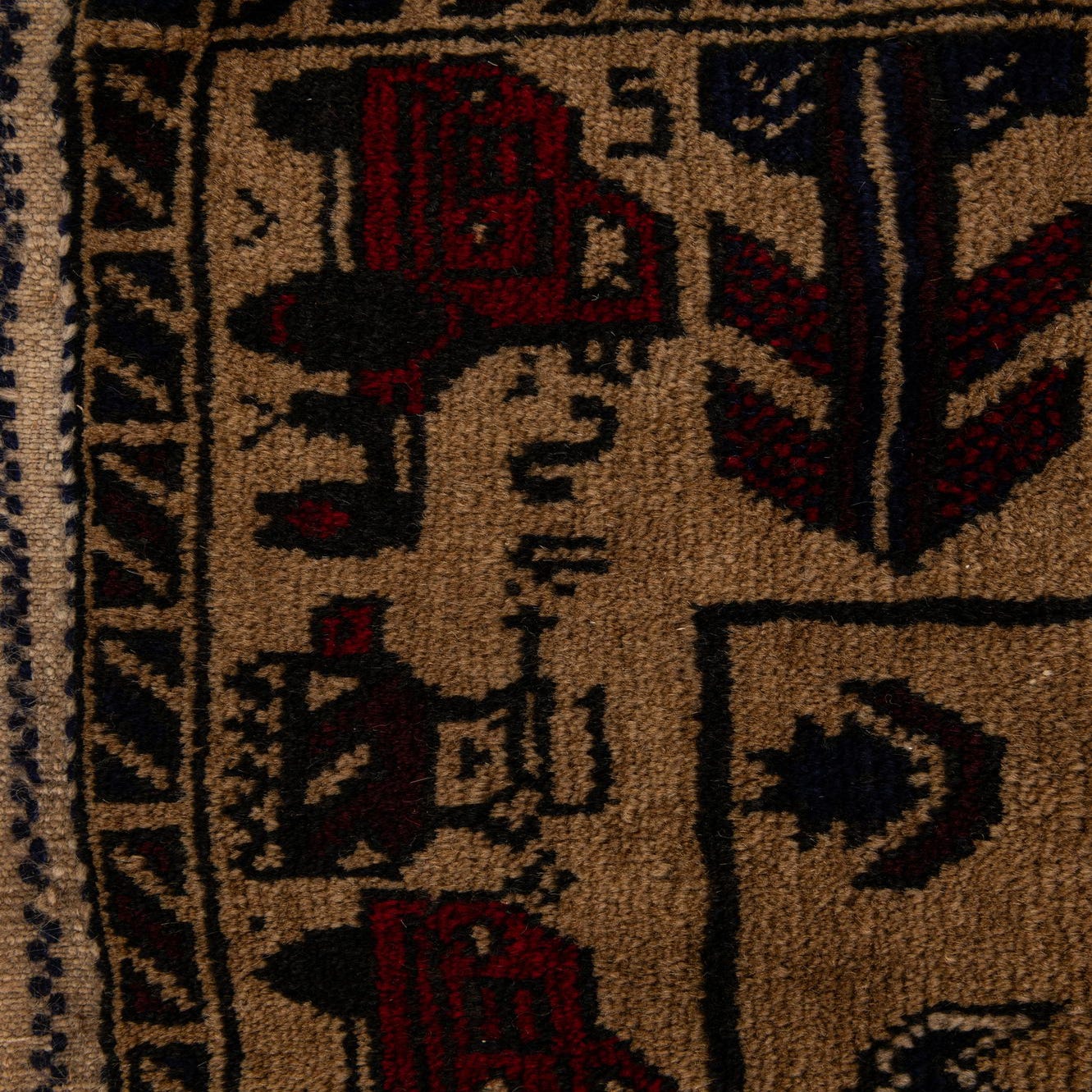 Primary color is Beige. Colors in this rug include: Beige, Ivory, Navy Blue, Red.