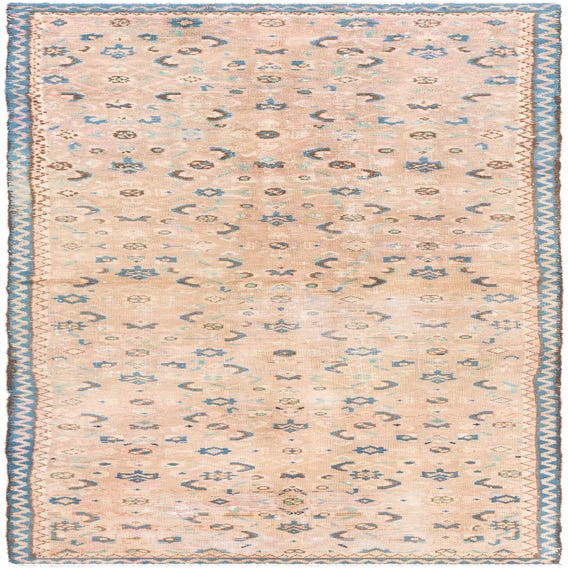 Primary color is Beige. Colors in this rug include: Beige, Blue, Brown, Rust Red.