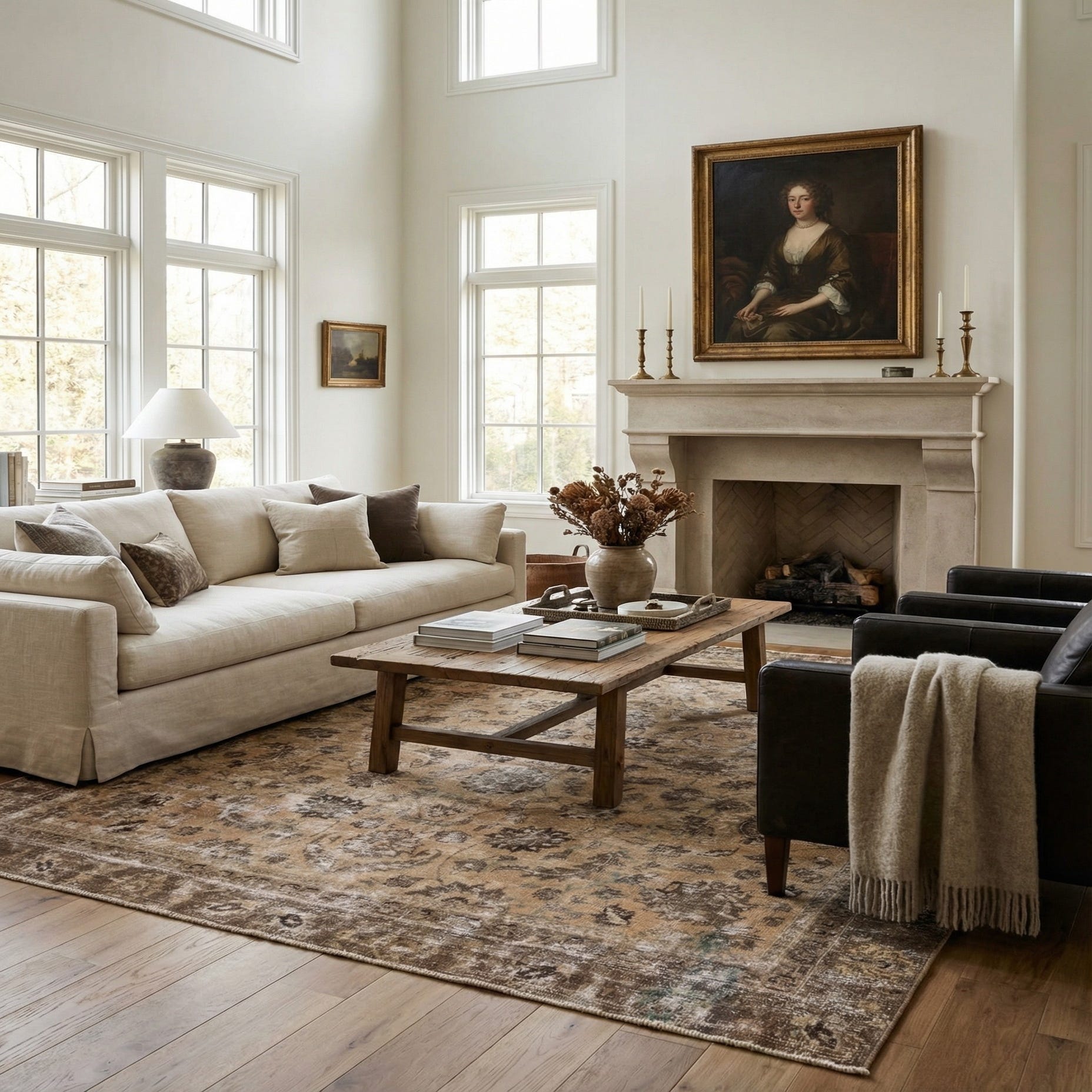 Primary color is Beige. Colors in this rug include: Beige, Brown, Ivory, Navy Blue.