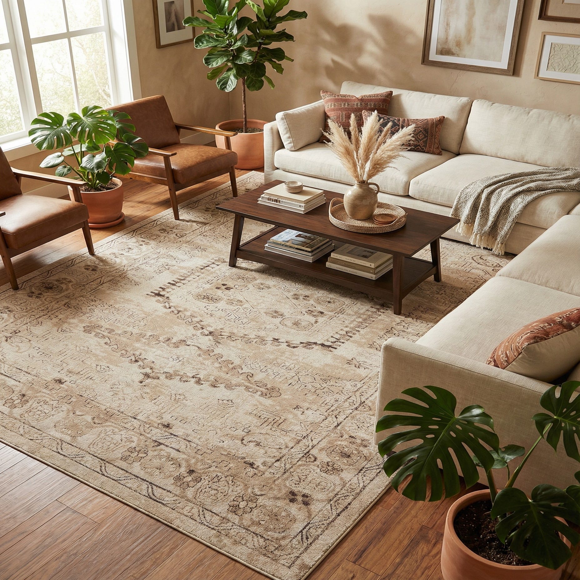 Primary color is Beige. Colors in this rug include: Beige, Cream, Brown, Ivory.