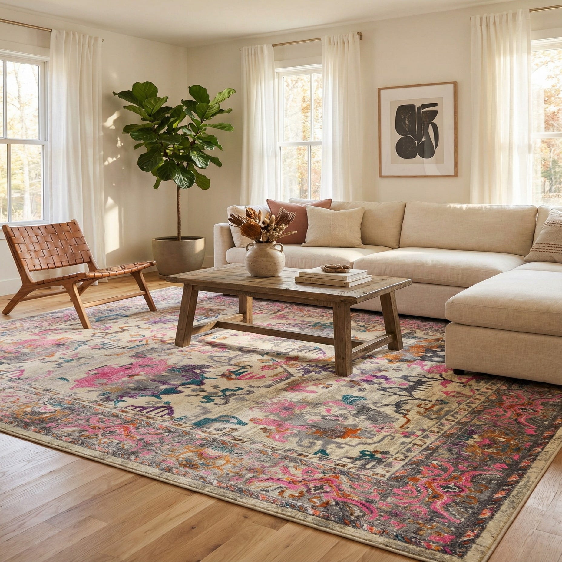 This rug pulls together our bedroom very nicely heightening the contemporary vibe we were looking for and adding a visual dreaming to the room. I would have liked it to be plusher but it does feel nice and soft underfoot. Be aware that this rug has a bit of a shine to it depending on how the light hits different parts of it. It looks considerably tanner from one direction than from the opposite direction. We positioned it to look lighter when entering the room the view pictured here. It may also appear slightly blotchy if all threads are not pointing the same way after vacuuming or walking over it. Since it is an abstract pattern this doesn’t bother us. But if you are using it in a room where you are likely to look at it from one direction as another or if you are sensitive to things not looking just so this may not be the rug for you.